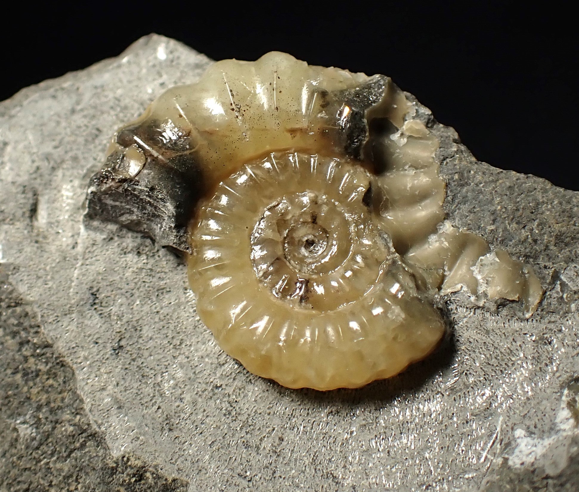 A stunning example of an ammonite fossil of the species Promicroceras planicosta from the world-famous Jurassic Coast beach of Lyme Regis, Dorset UK.