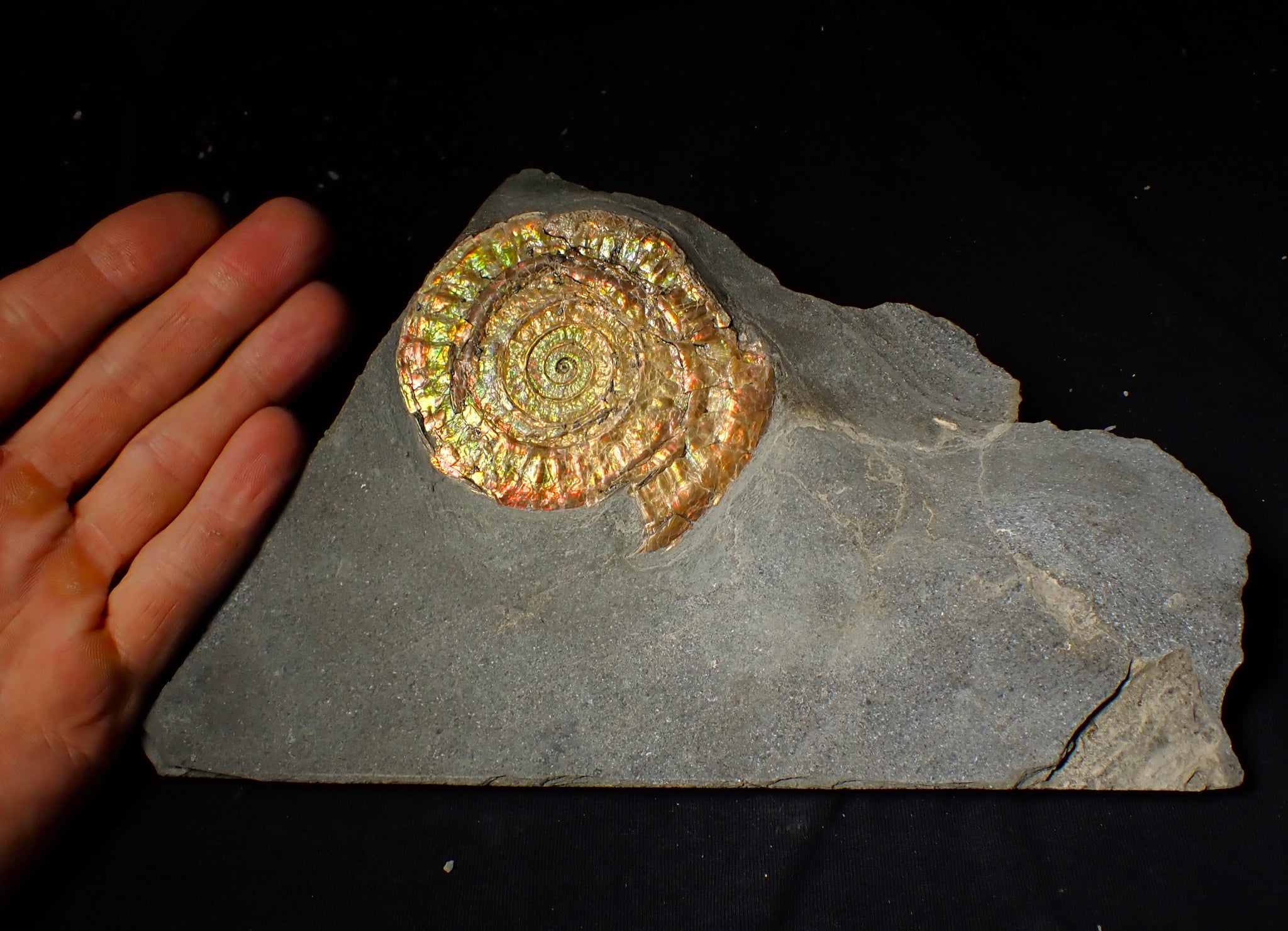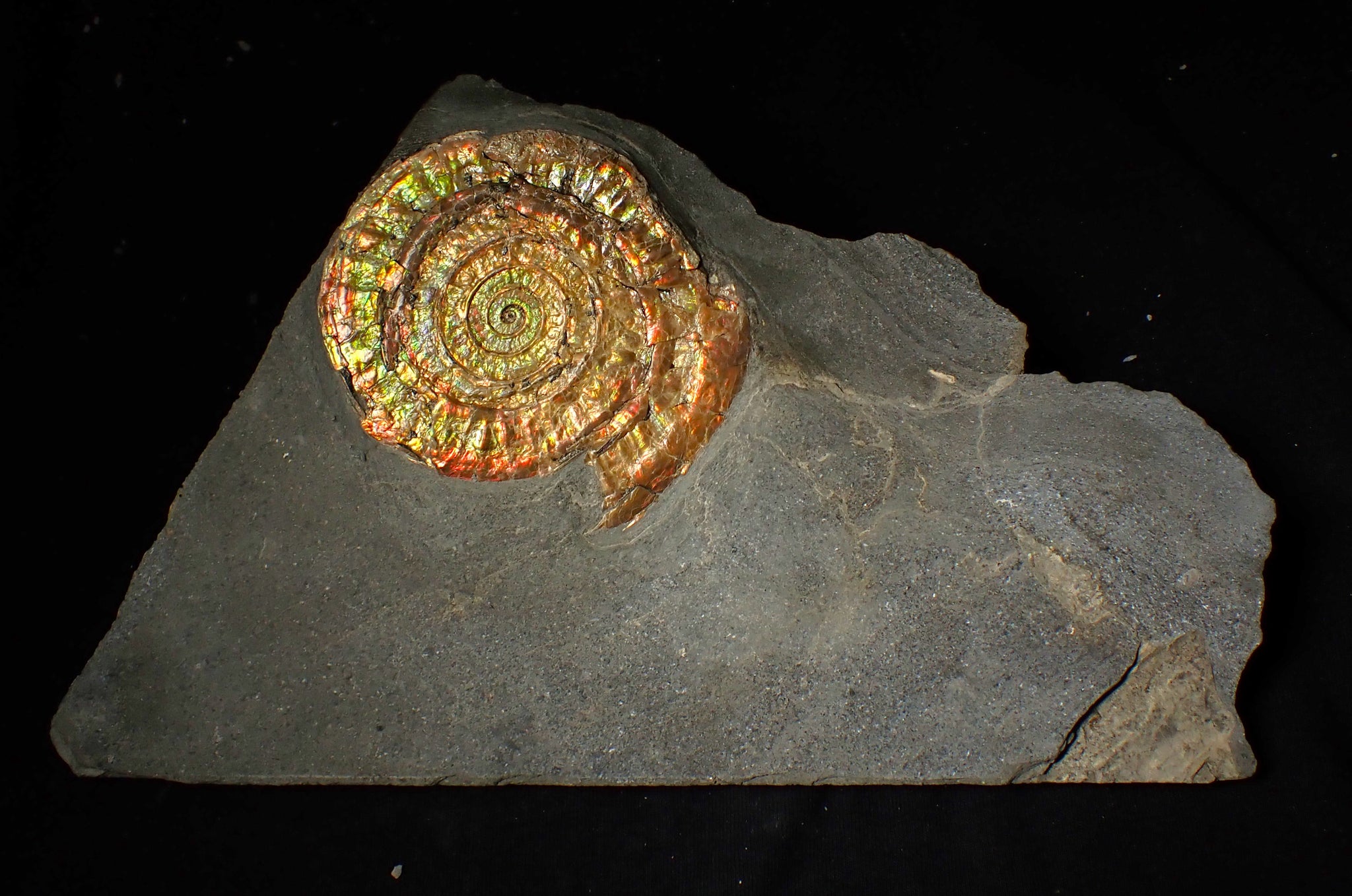These fossils are highly sought after and hard to find, especially large complete examples like this one. They are preserved in the same way as the famous Canadian "Ammolite" ammonites that are turned into valuable gemstones. These fossils make great unusual gifts and each one is totally unique.