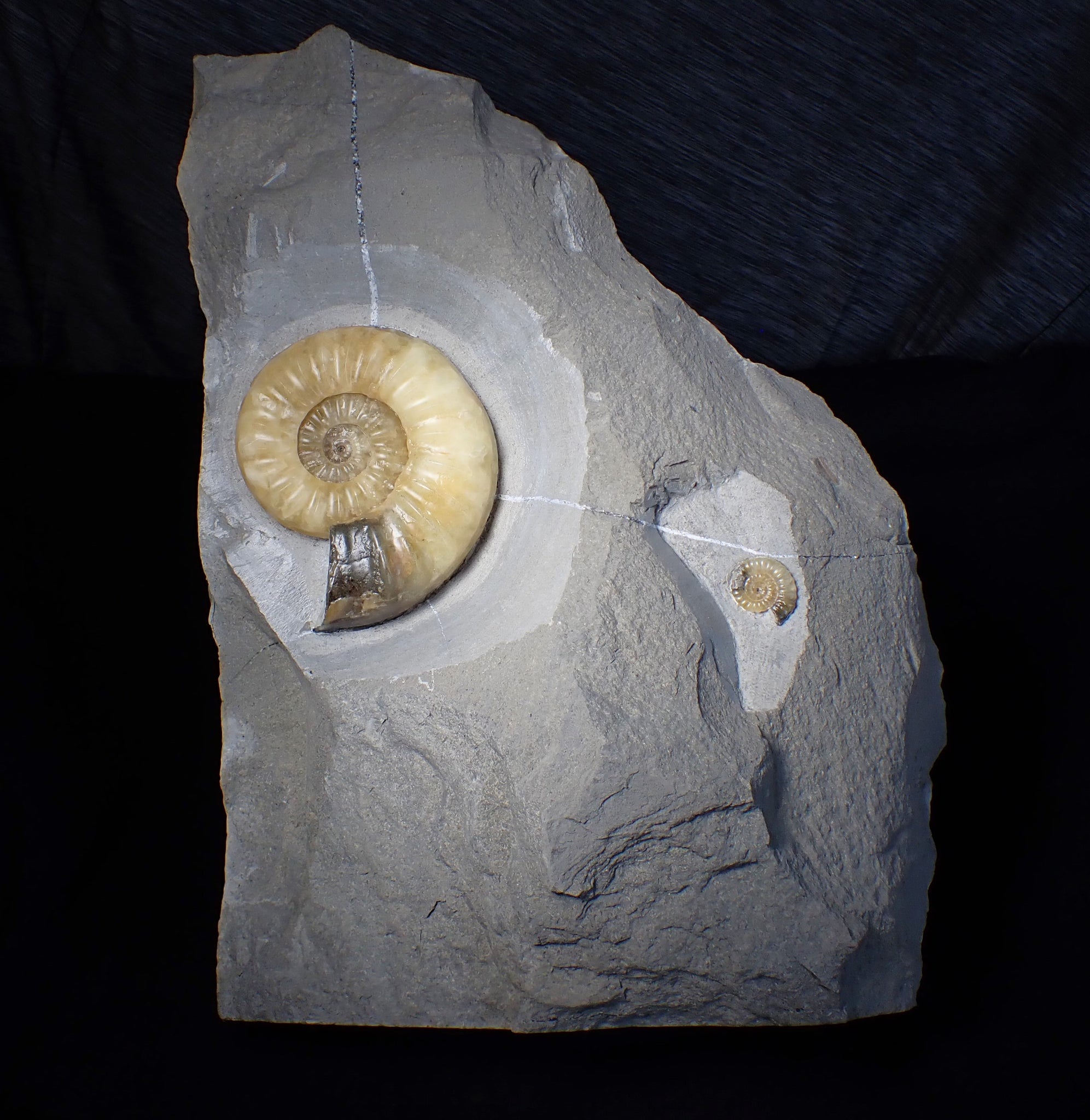 The piece of limestone matrix measures 270 mm (10.62 inches) tall and the fossil ammonite measures 87 mm (3.42 inches) across. The ammonite is very well preserved and has been prepared out of the rock to reveal the details of the shell. The ribs are very finely defined, and the pale yellow colour is beautiful. It is unusual to find a large Asteroceras like this preserved in pure yellow calcite. There is also a smaller ammonite of the species Promicroceras planicosta to the side of the main ammonite.