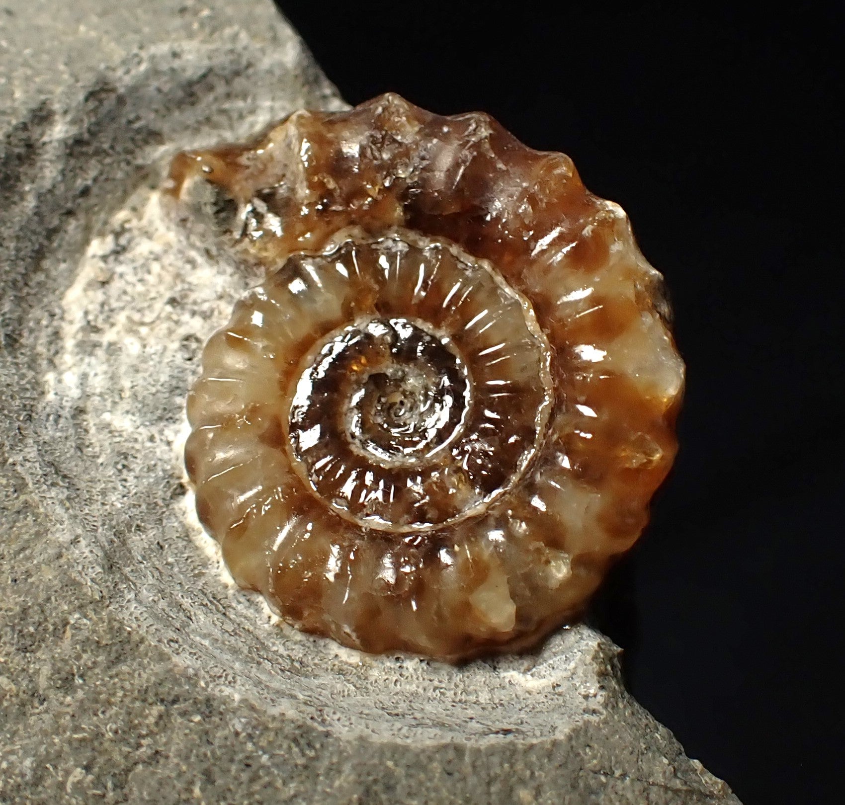 The piece of limestone matrix measures 65 mm (2.6 inches) tall and the fossil ammonite measures 23 mm (0.9 inches). The ammonite is well preserved and has been prepared out of the rock to reveal the shell. The ribs are finely defined, and the mix of brown colours is beautiful.