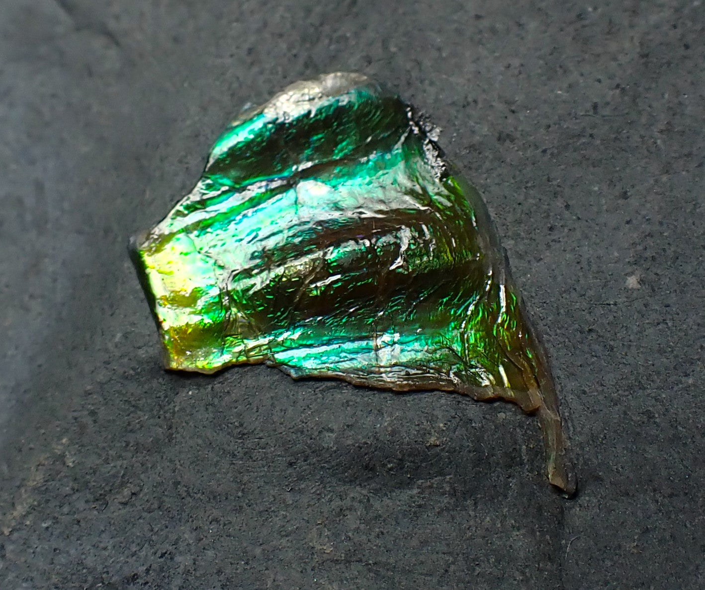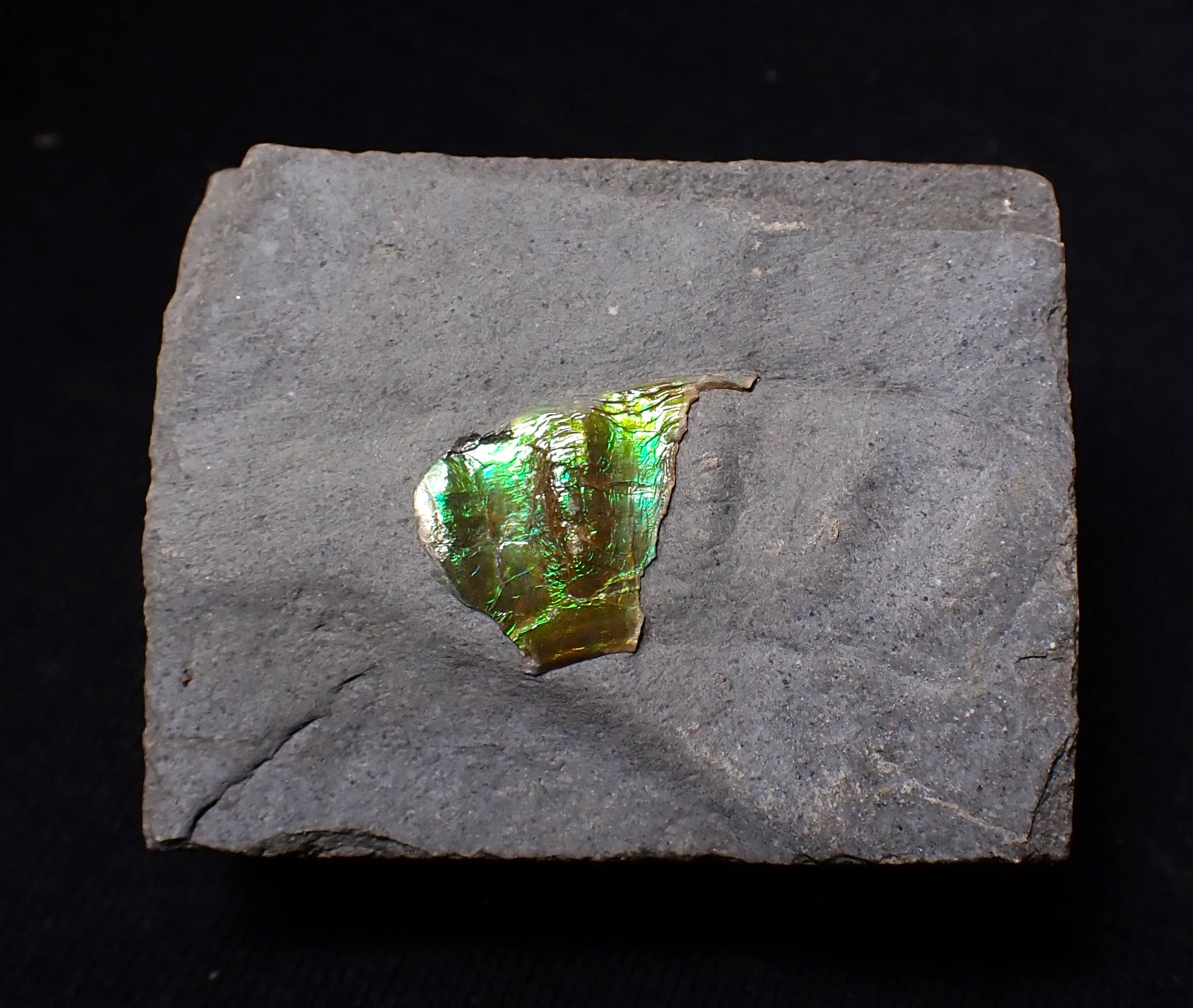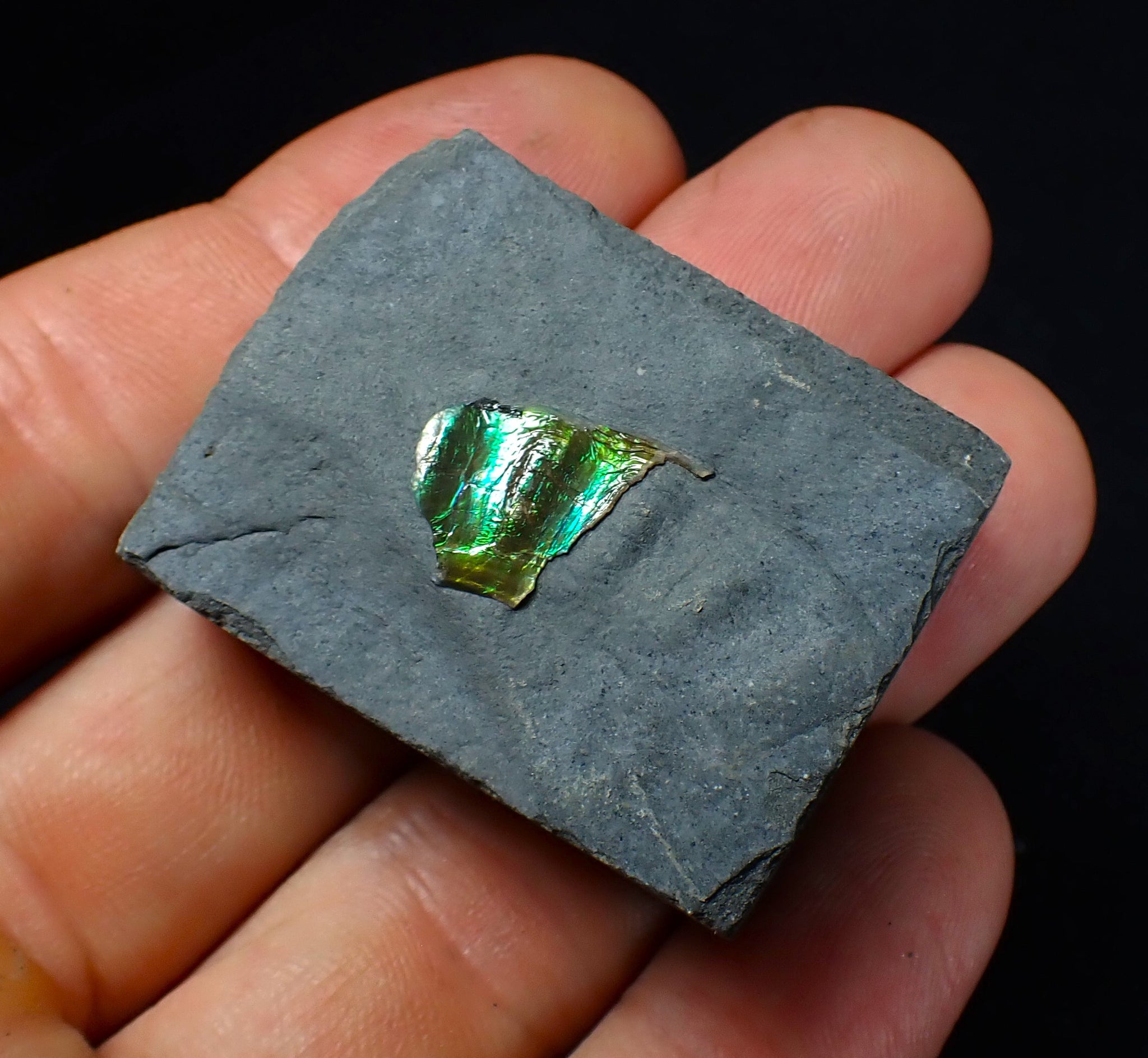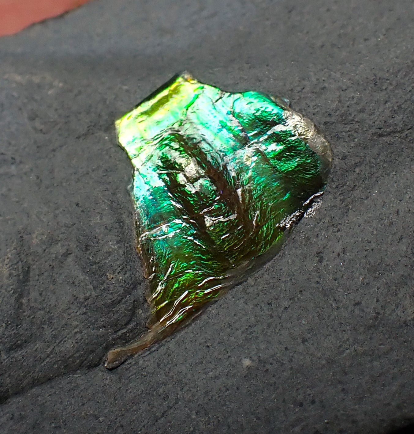 The ammonite shell piece is well preserved and has been prepared out of the rock to reveal the colours, which display some stunningly bright iridescence that changes as the viewing angle changes, with green and blue dominating. these little piece of broken ammonite shell look like jewels in these pieces of rock.