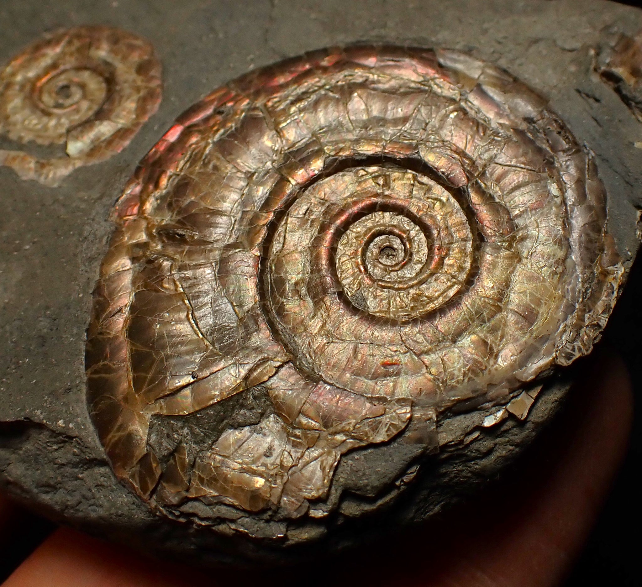 A stunning example of an iridescent ammonite fossil of the species Psiloceras planorbis from North Somerset, UK.