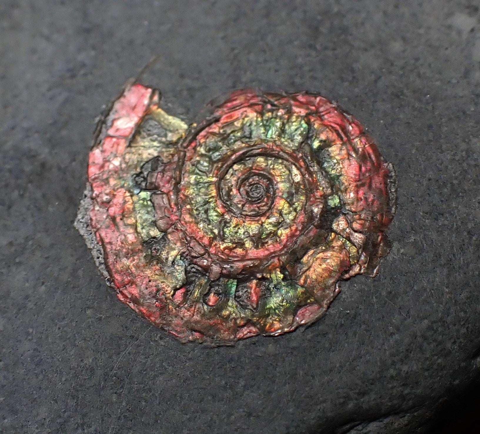 A stunning example of an iridescent ammonite fossil of the species Psiloceras planorbis from North Somerset, UK.