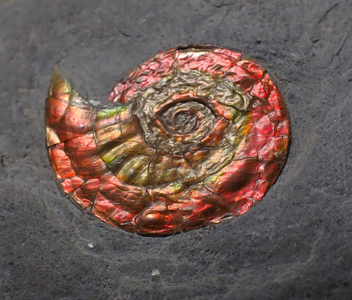 Juvenile iridescent red Psiloceras ammonite fossil (15mm)