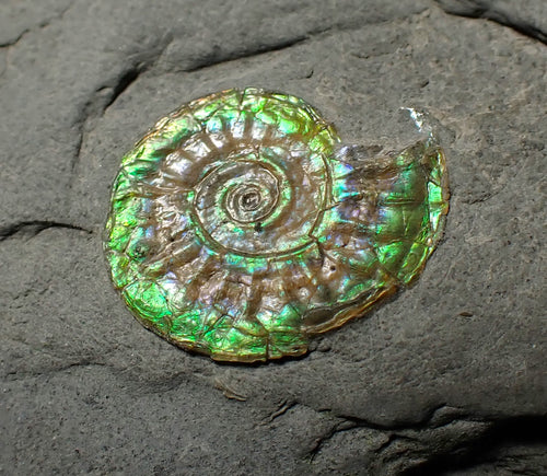 Tiny juvenile iridescent green Psiloceras ammonite fossil (13mm)