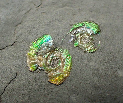 Juvenile green iridescent multi-Psiloceras ammonite fossil