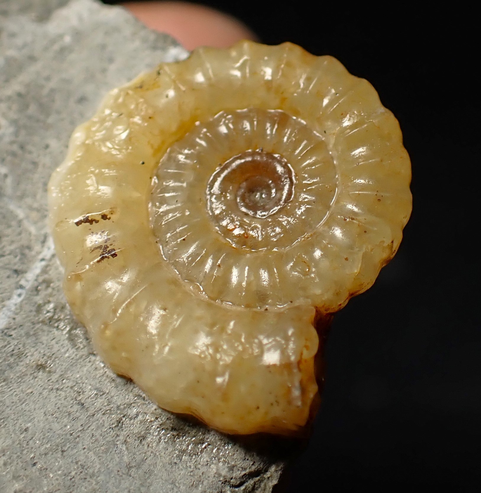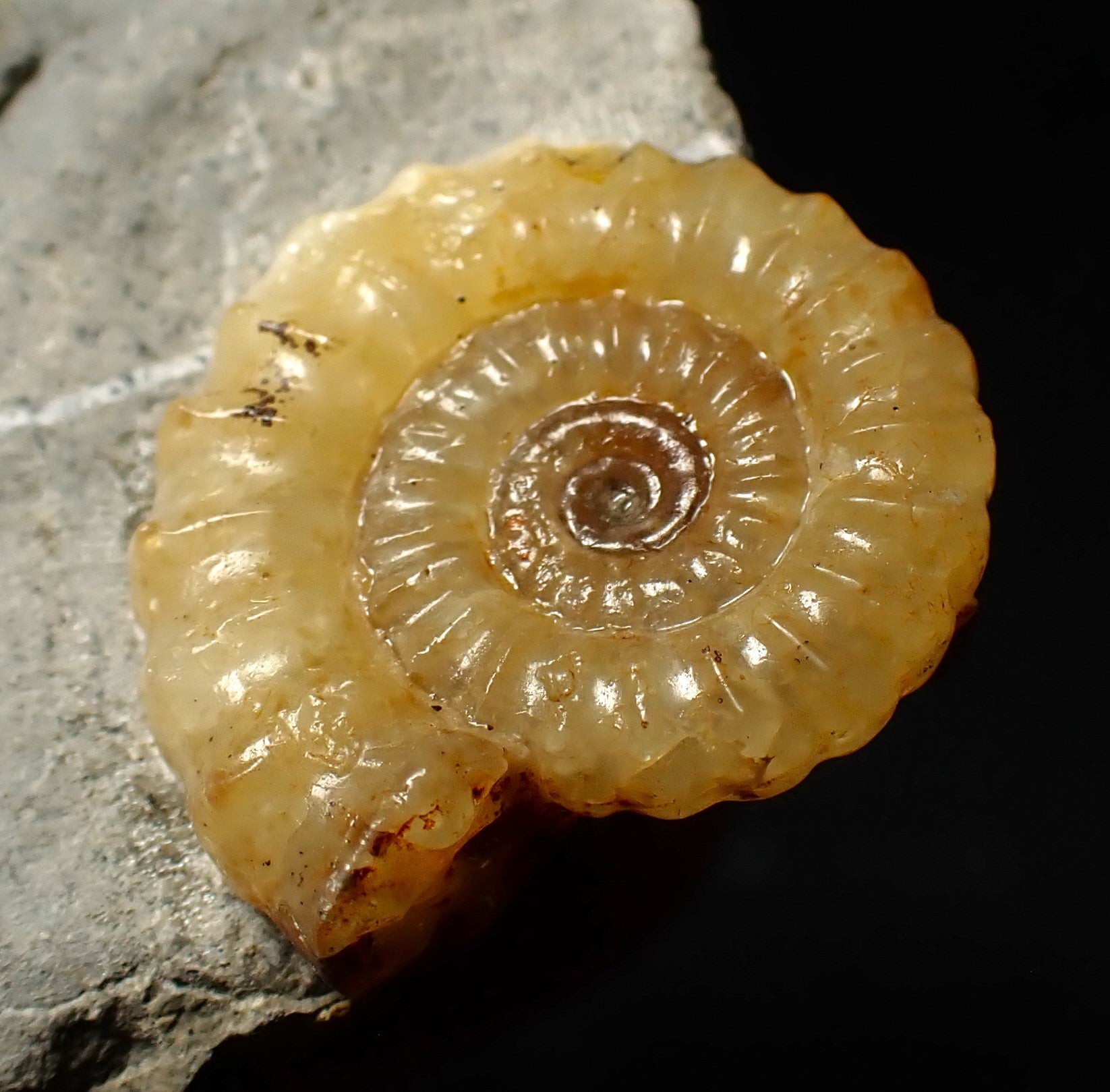 The piece of limestone matrix measures 77 mm (3.1 inches) across and the fossil ammonite measures 22 mm (0.85 of an inch). The ammonite is well preserved and has been prepared out of the rock to reveal the shell, which is perfectly preserved to the centre and has a lovely yellow colour.