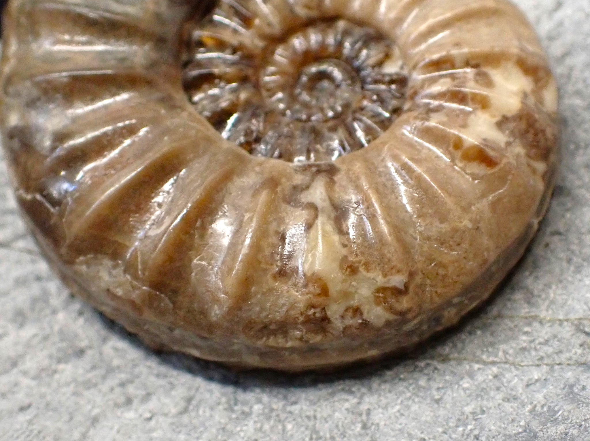 The piece of limestone matrix measures 265 mm (10.4 inches) across and the fossil ammonite measures 58 mm (2.3 inches) across. The ammonite is very well preserved and has been prepared out of the rock to reveal the whole shell including the distinctive ribbed keel. The ribs are very finely defined, and the colour is beautiful and very unusual for these fossils: a mottled mix of brown, beige, and grey. The suture lines are very well defined on this one.
