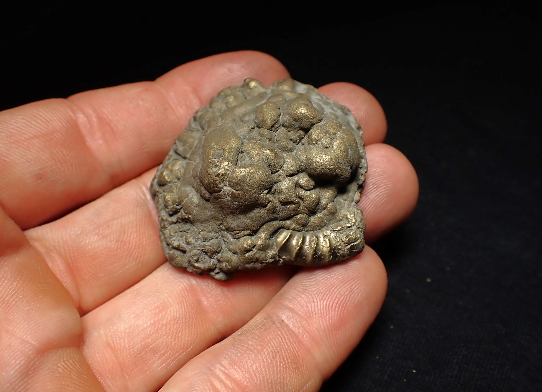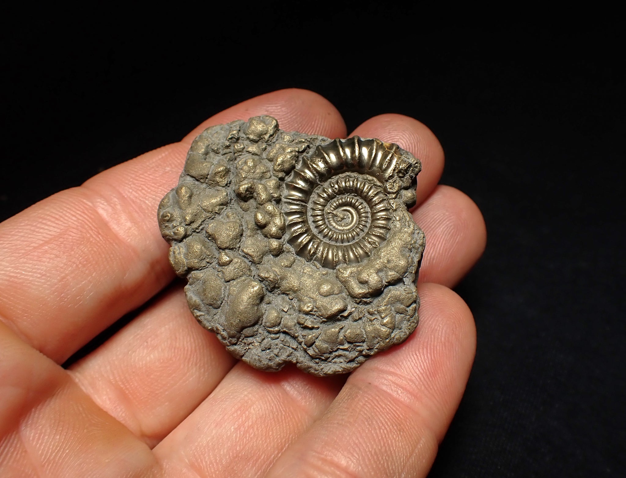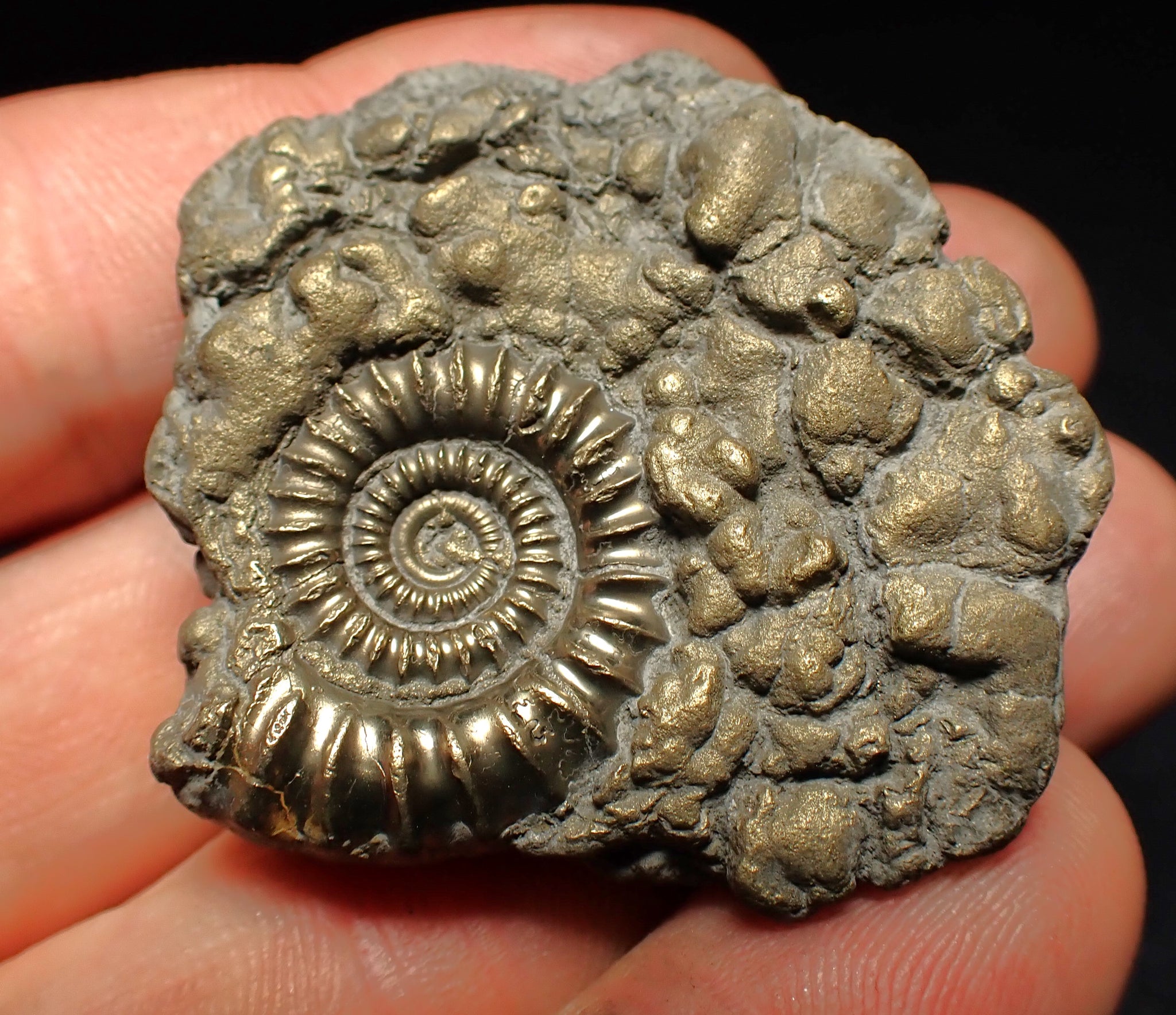 A stunning example of a highly pyritised ammonite fossil of the species Crucilobiceras densinodulum from the world-famous Jurassic Coast beach of Charmouth, Dorset UK.
