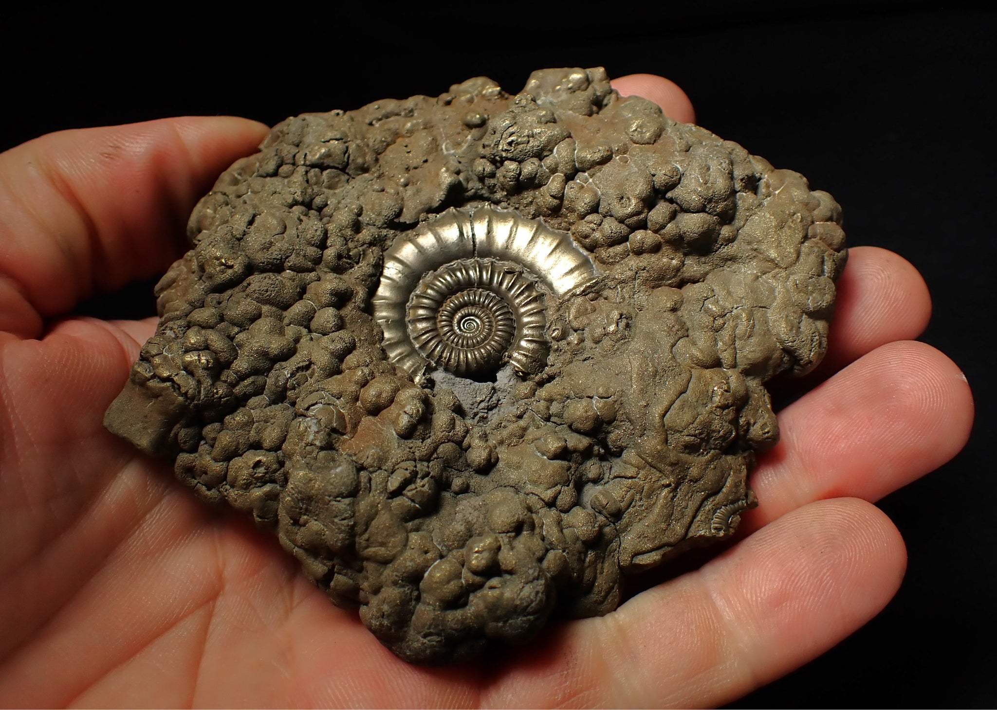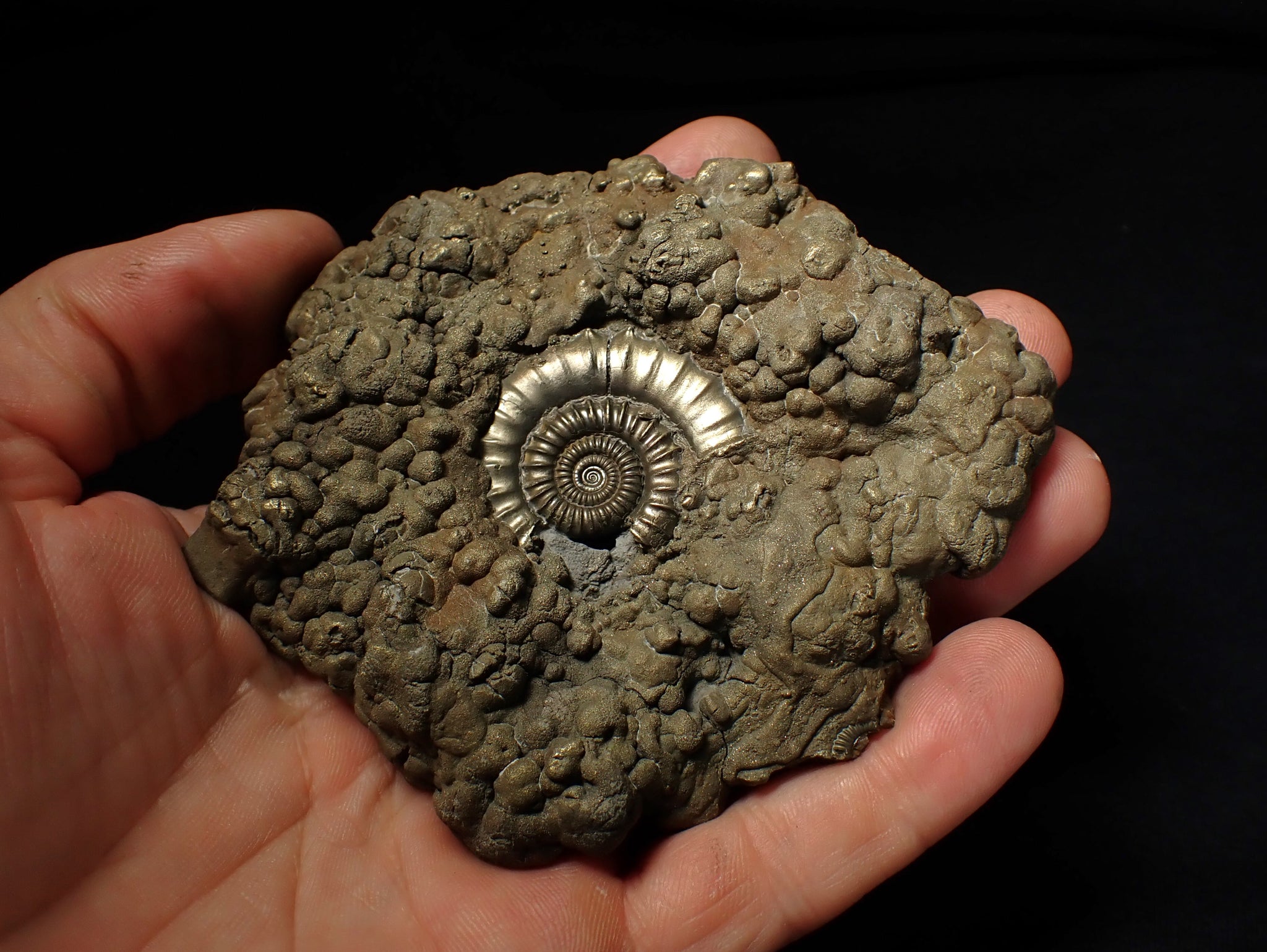 The fossil measures 102 mm (4.1 inches) across with matrix, which is huge for this species and about as big as they get. The ammonite shell is very well preserved with great detail in the ribbing and suture lines in the centre of the matrix which represents the outer whorl of the shell. It has a beautiful pyritic metallic shine. These large Crucilobiceras ammonites are uncommon as most are much smaller and they don't get much bigger than this! A real one-off fossil. It weighs 310 grams.