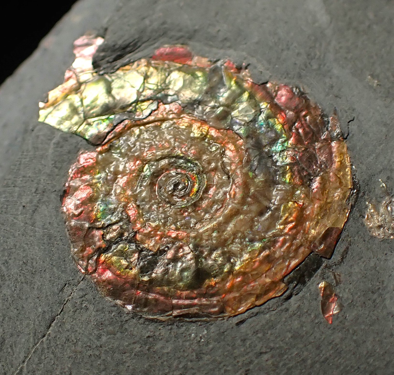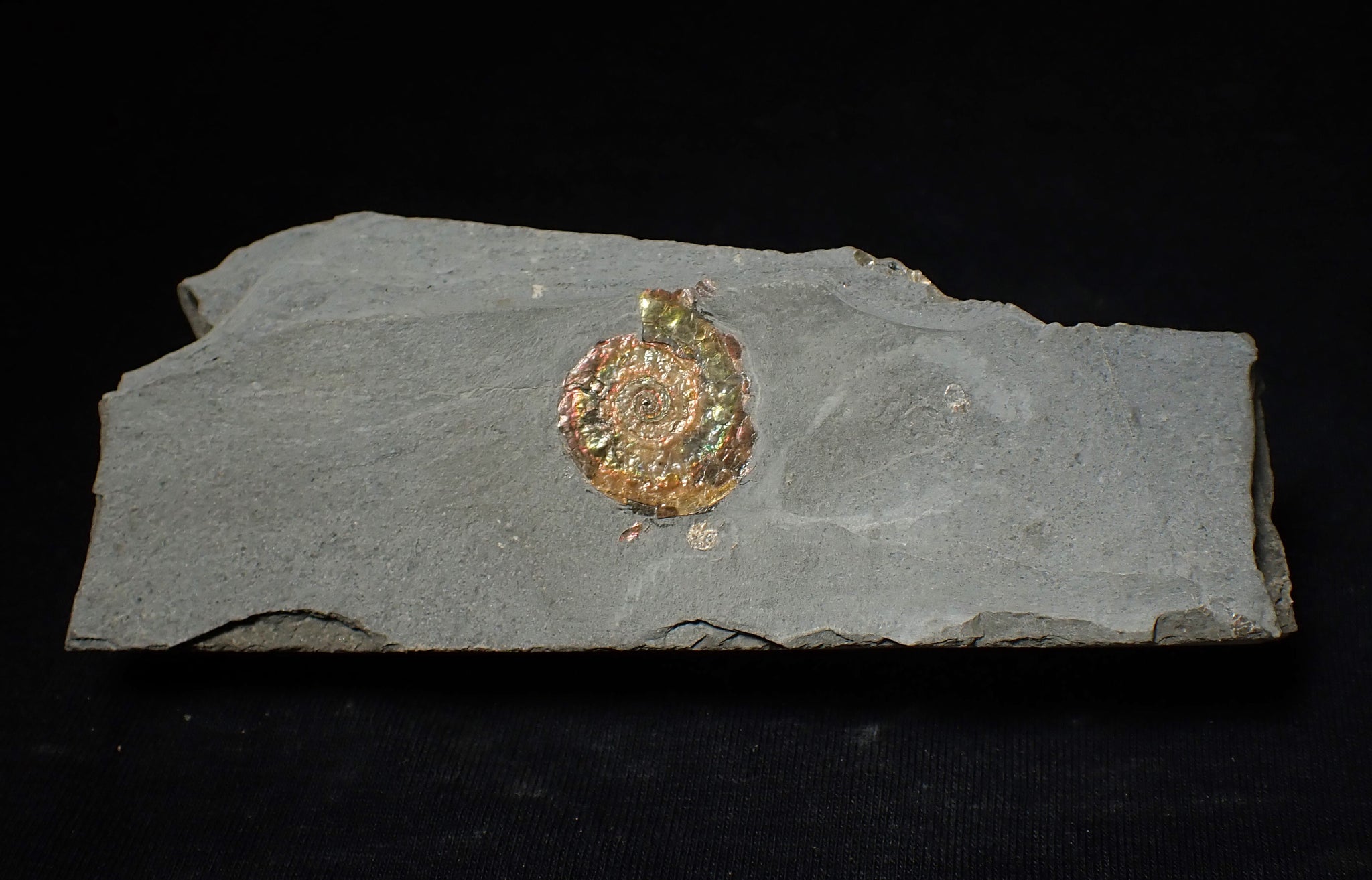 A stunning example of an iridescent ammonite fossil of the species Psiloceras planorbis from North Somerset, UK.