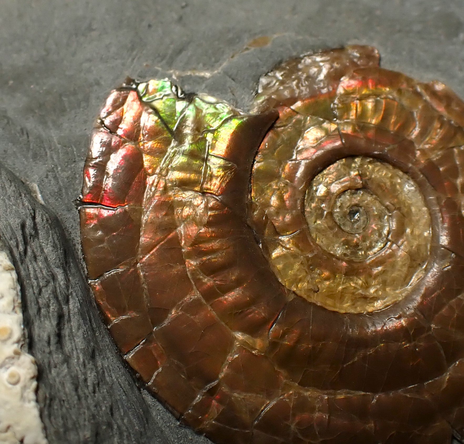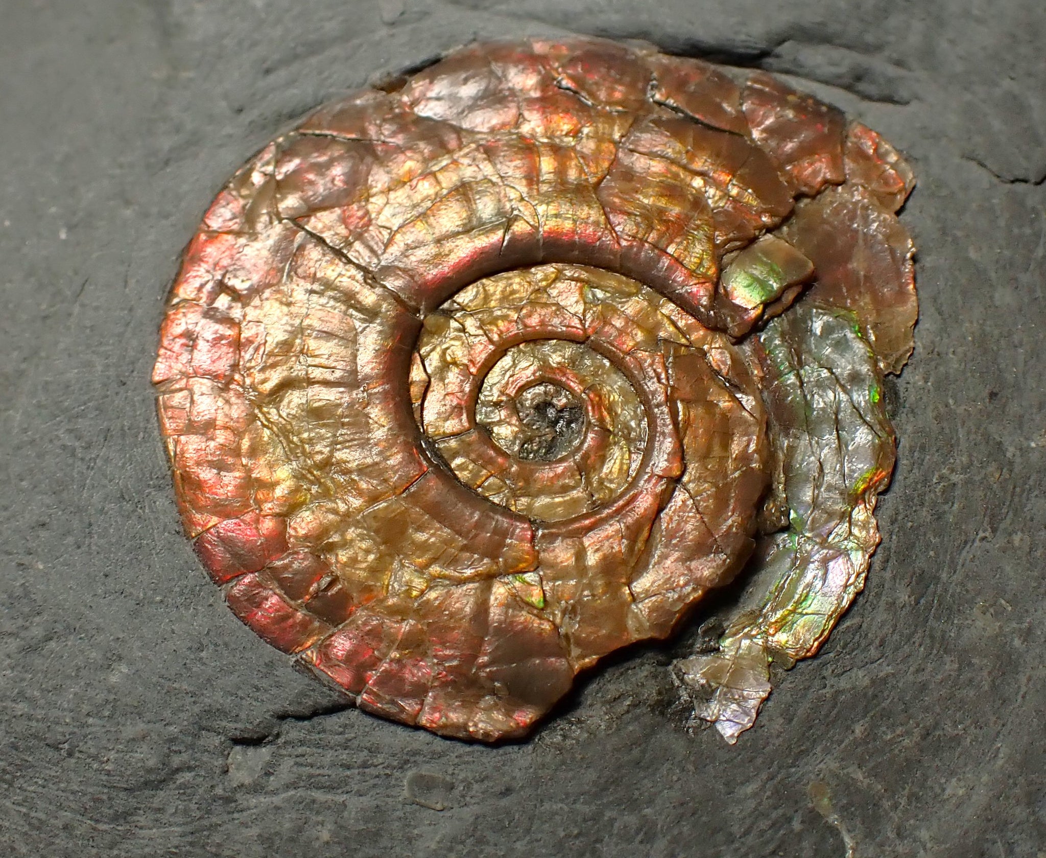 A stunning example of an iridescent ammonite fossil of the species Psiloceras planorbis from North Somerset, UK.