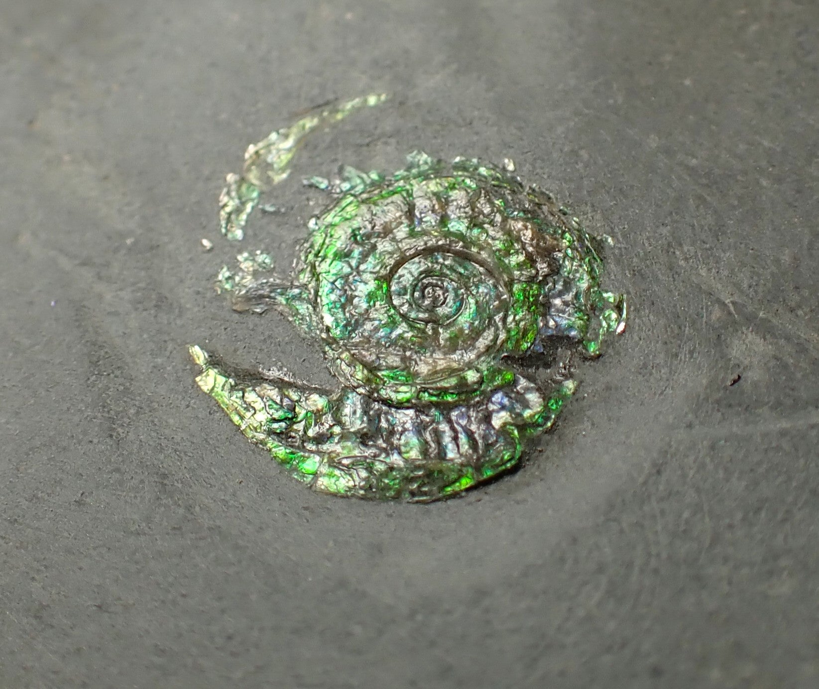 The ammonite is very well preserved and has been prepared out of the rock to reveal the shell, which displays some beautiful iridescence that changes as the viewing angle changes, with green colours dominating. The whole piece weighs 110 grams.