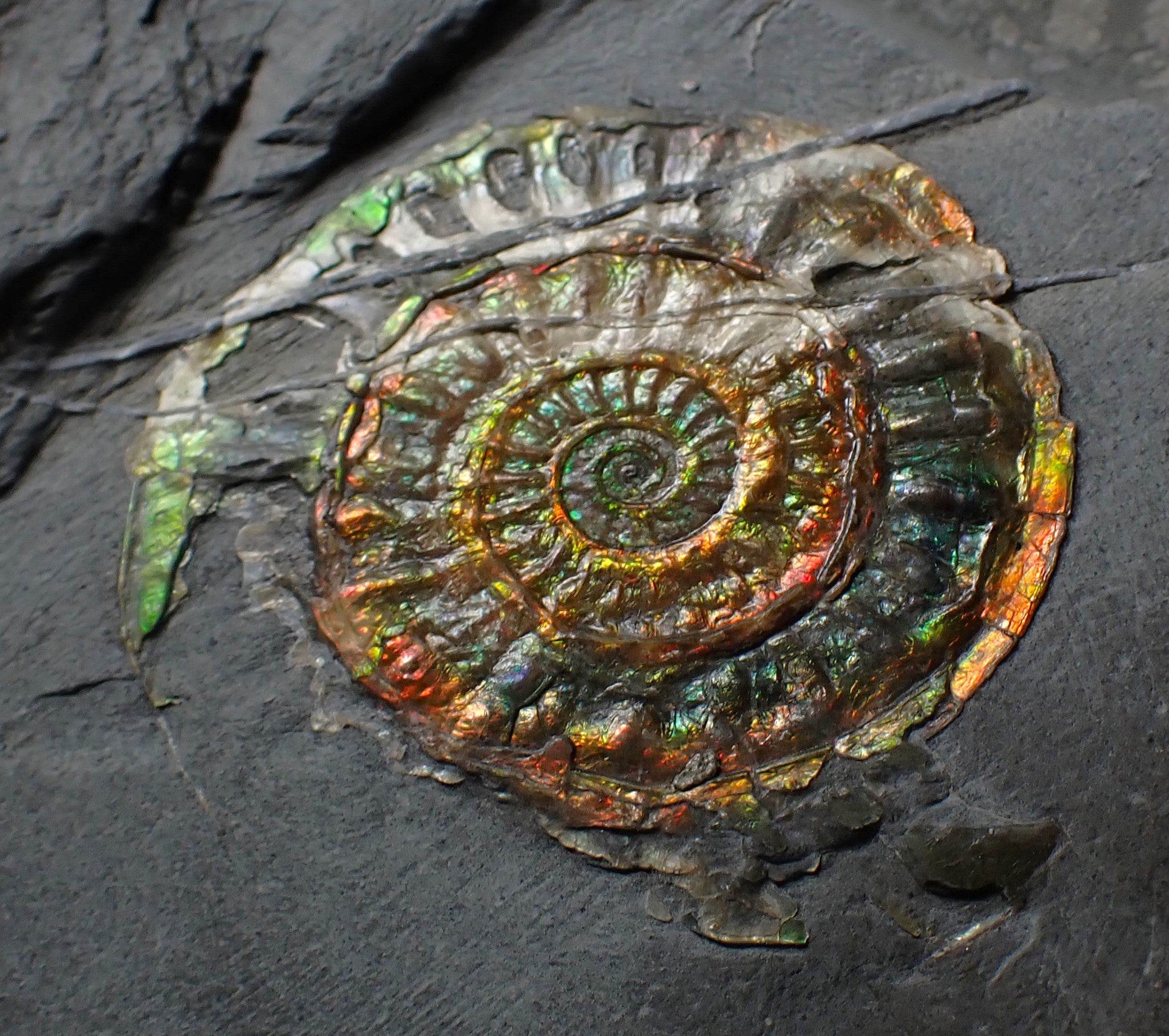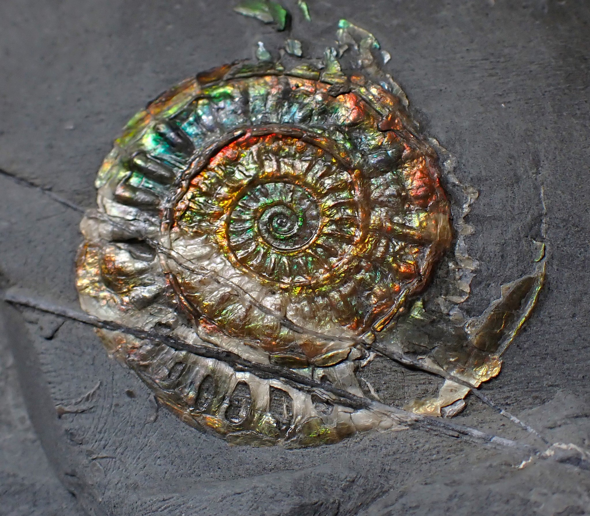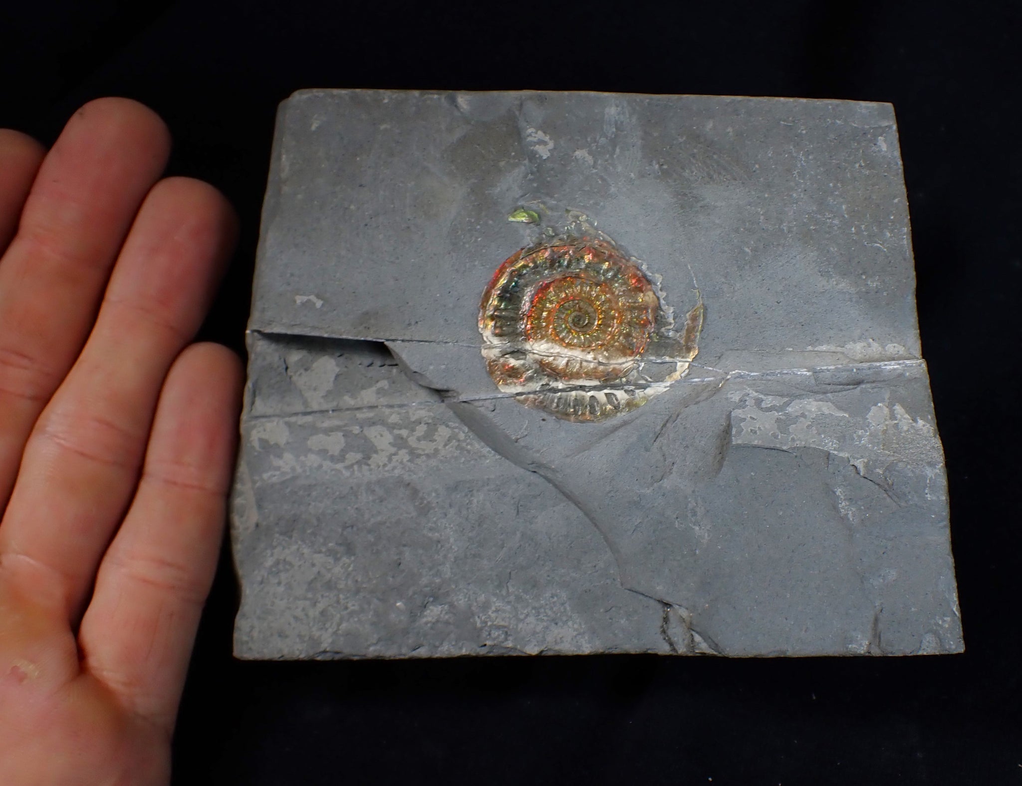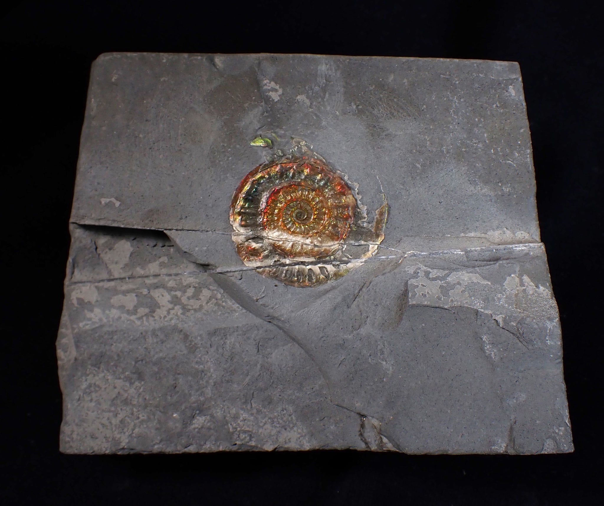 The ammonite is very well preserved and has been prepared out of the rock to reveal the shell, which displays some beautiful iridescence that changes as the viewing angle changes, with red, green, and gold colours dominating. There are some unusual natural fault lines running through the limestone matrix that criss-cross the ammonite. Where the cross the ammonite, the shell colour has changed to white. This is an entirely natural geological phenomenon, giving the fossil an even more interesting story. The whole piece weighs 535 grams.