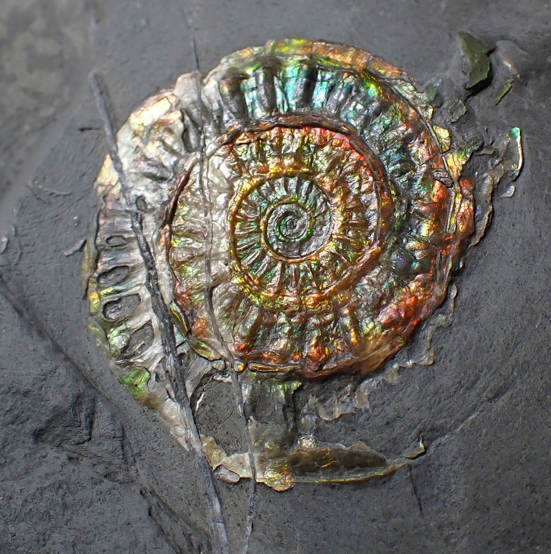 A stunning example of an iridescent ammonite fossil of the species Caloceras johnstoni from North Somerset, UK.