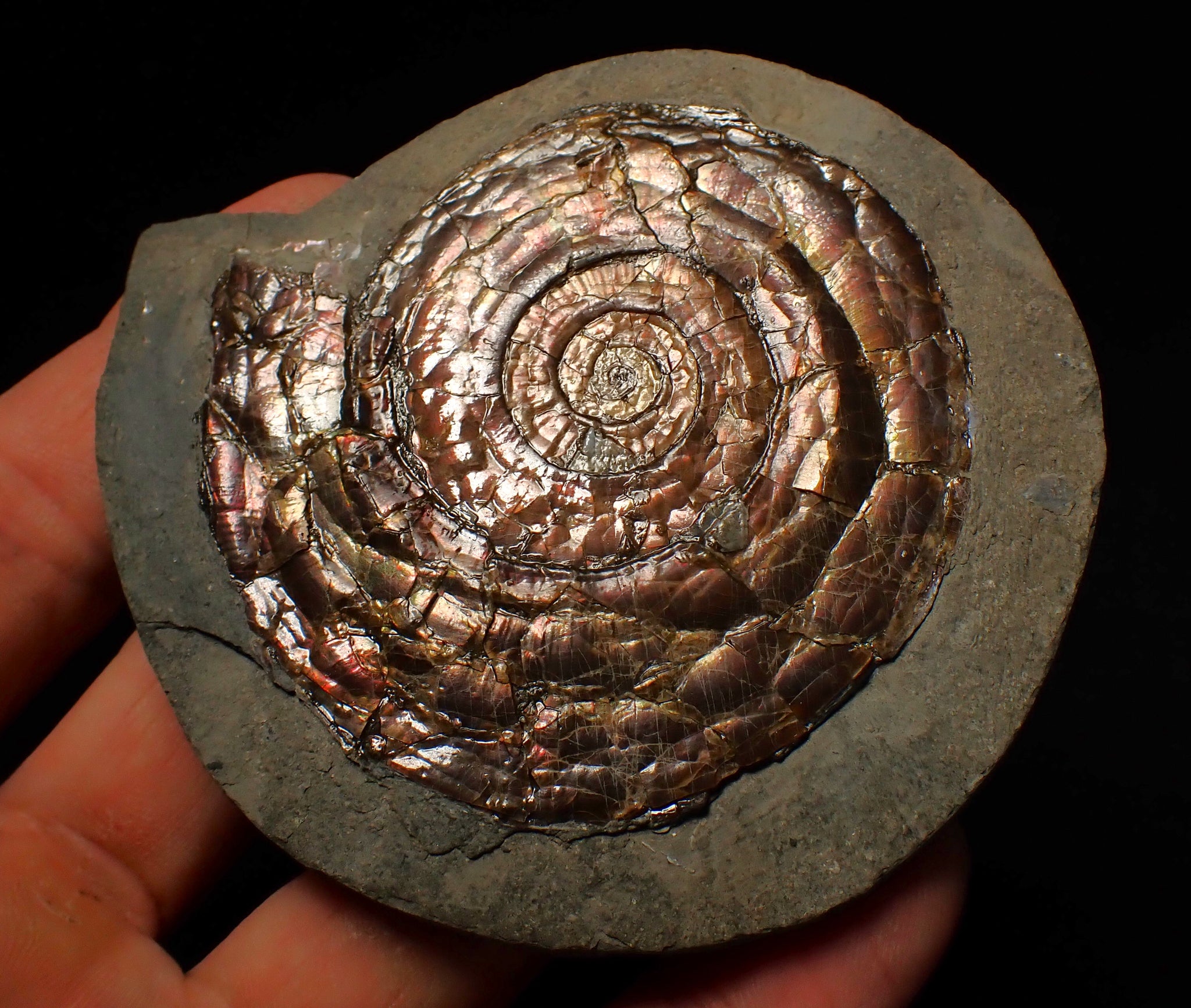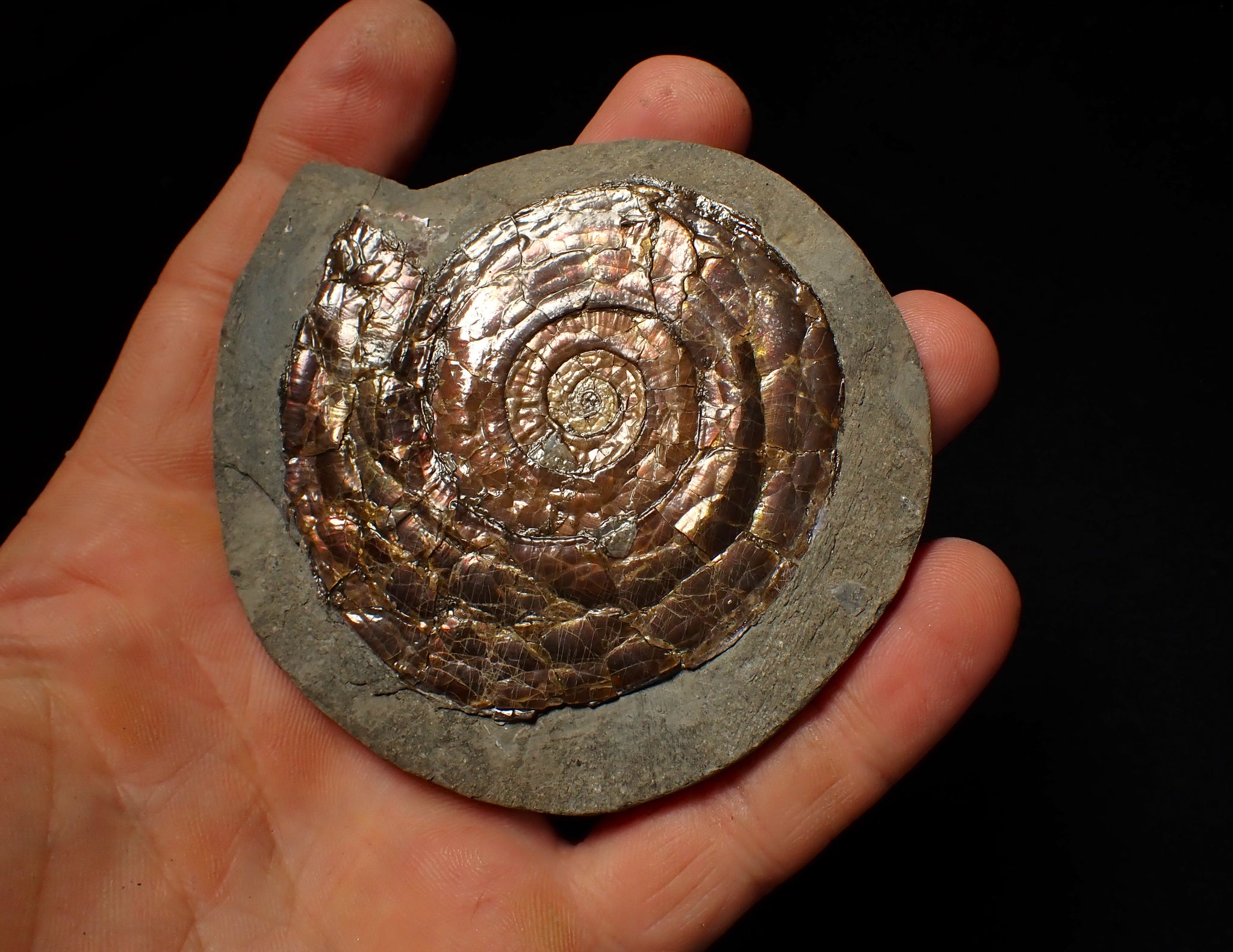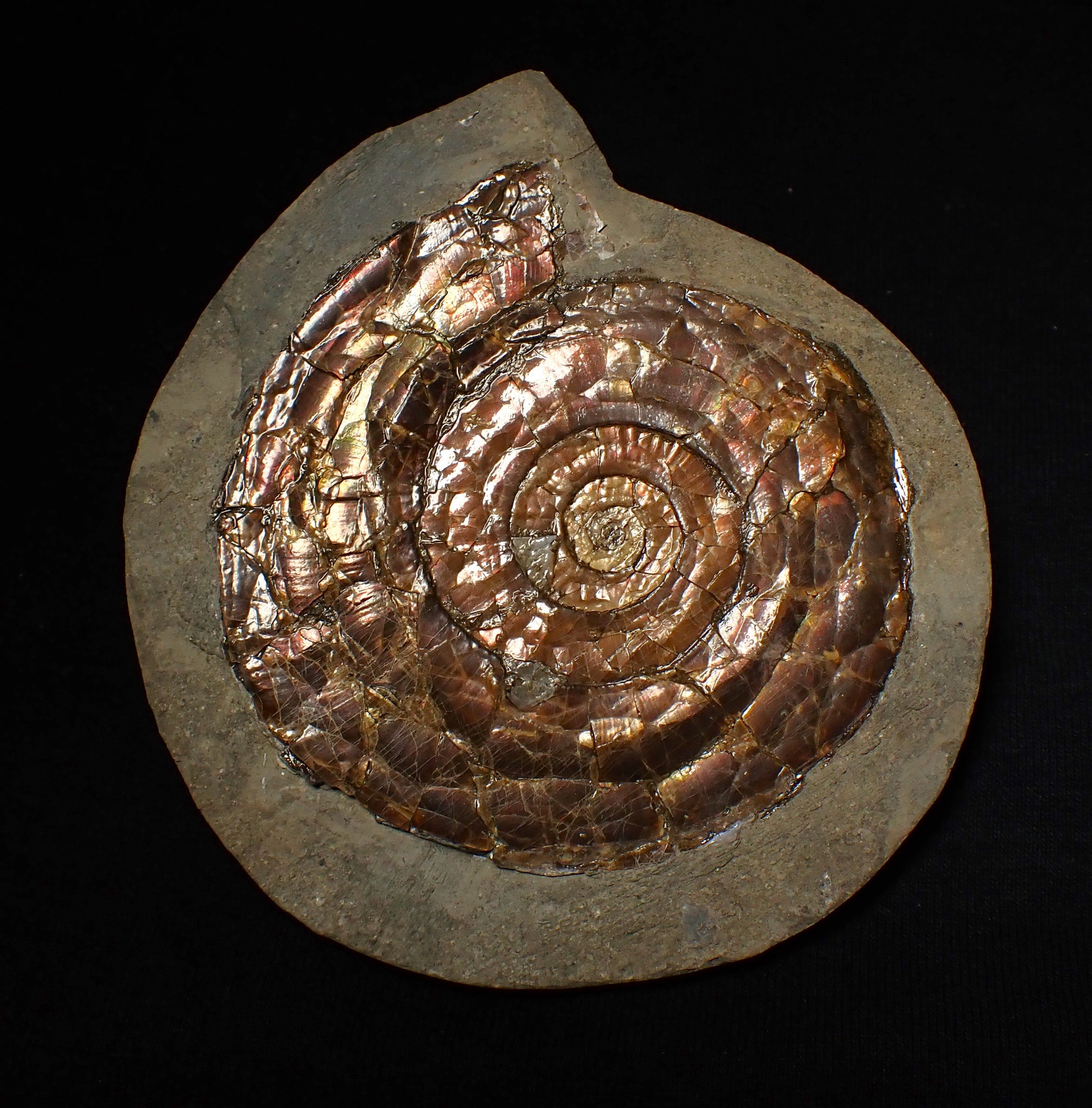 A stunning example of an iridescent ammonite fossil of the species Psiloceras planorbis from North Somerset, UK.
