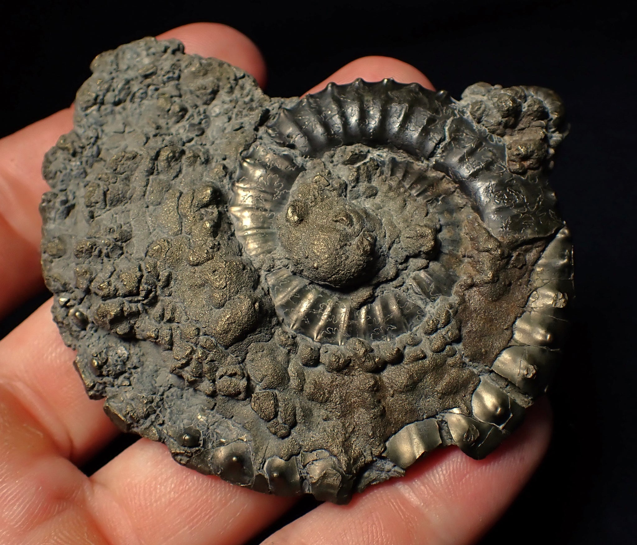 A stunning example of a highly pyritised ammonite fossil of the species Crucilobiceras densinodulum from the world-famous Jurassic Coast beach of Charmouth, Dorset UK.