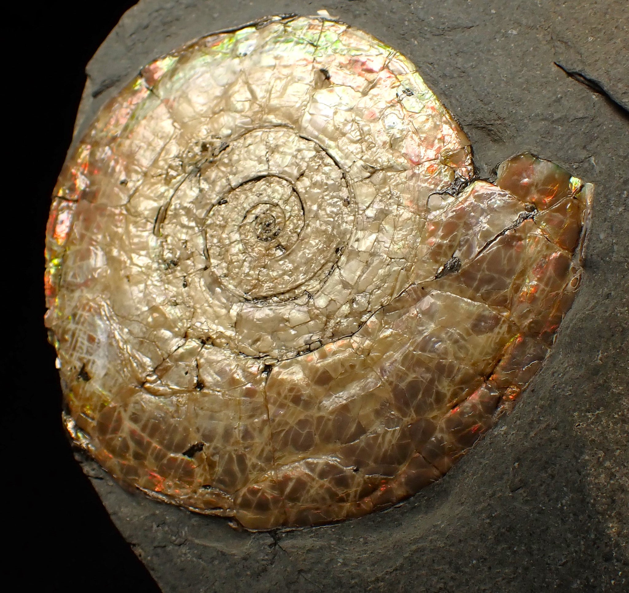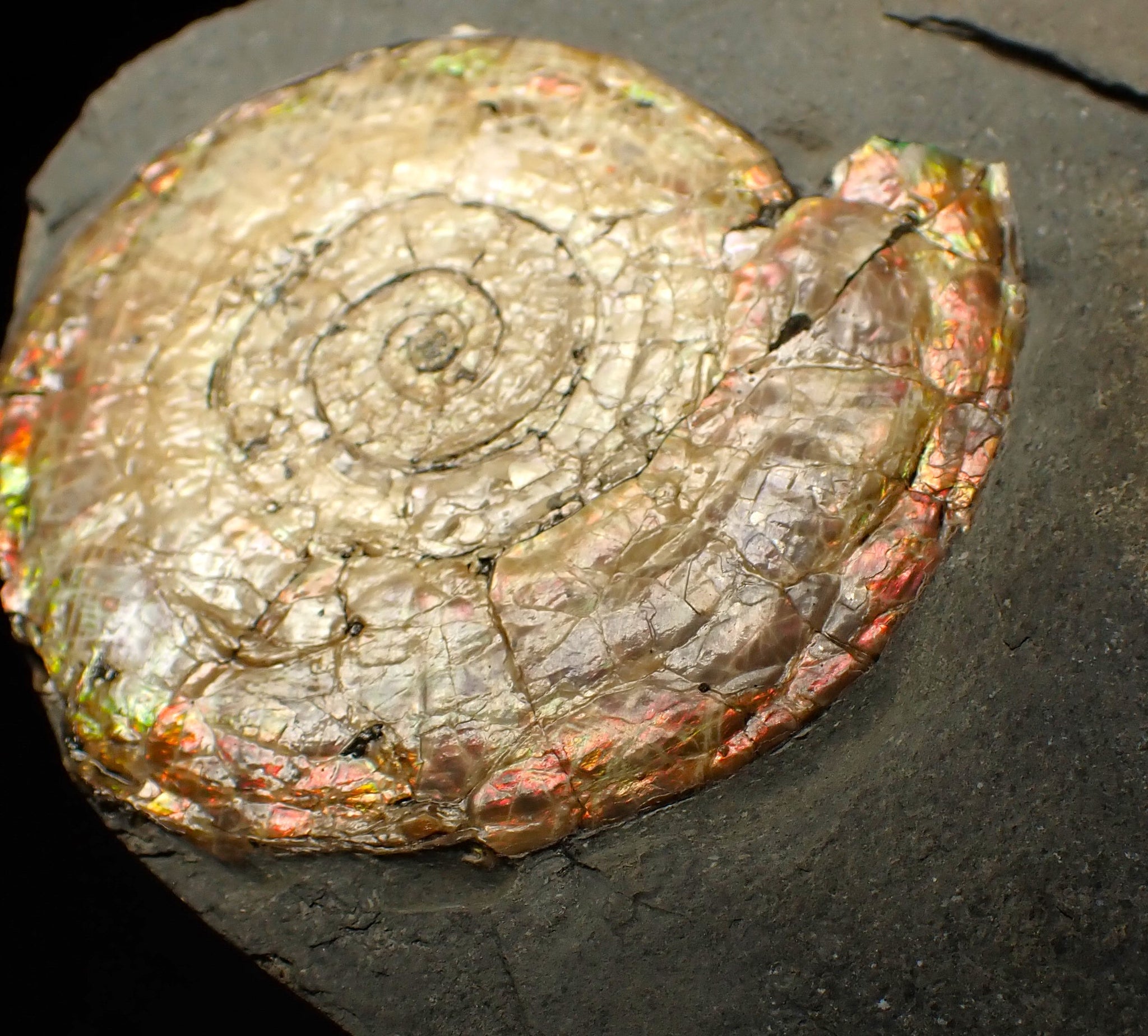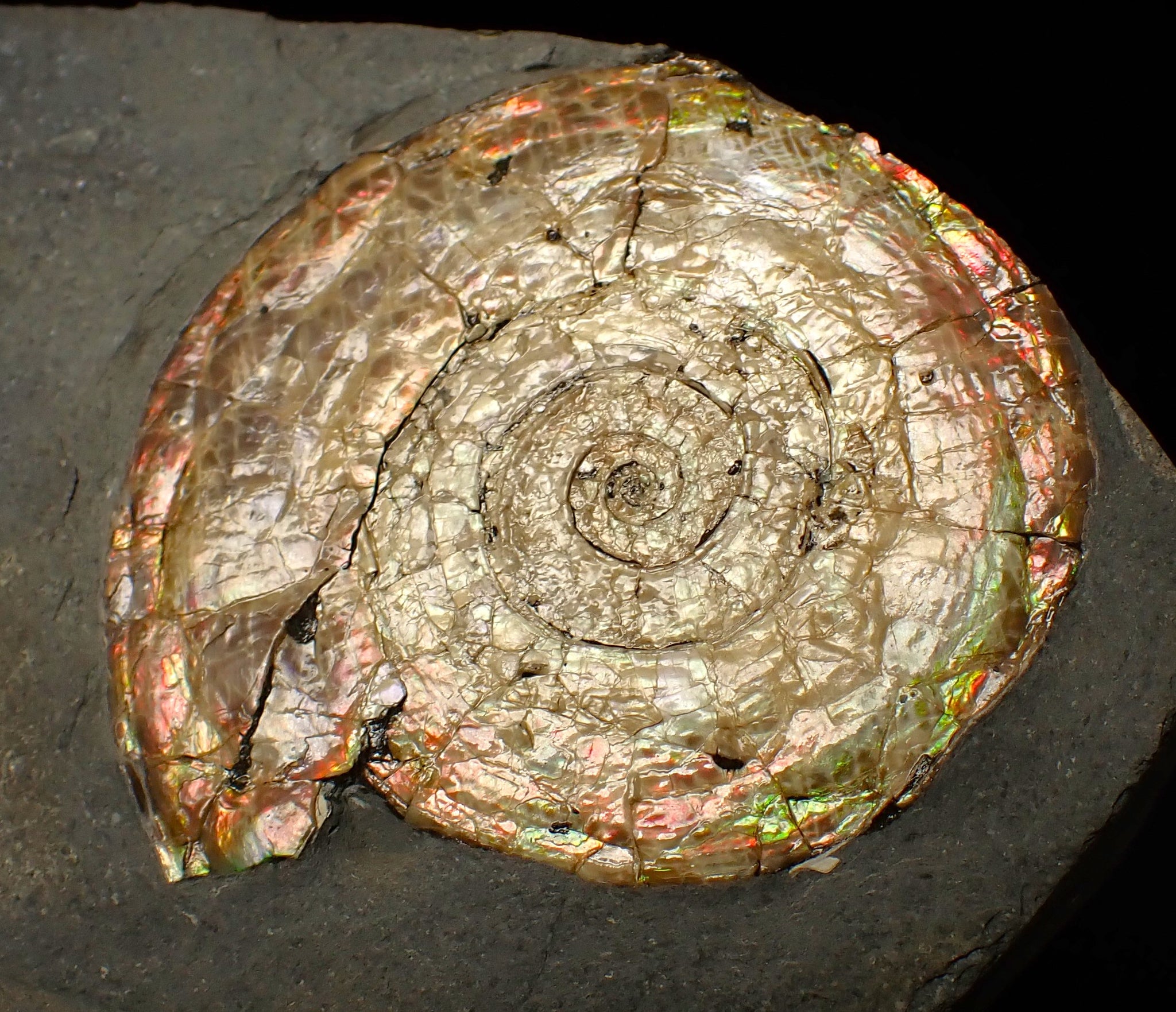A stunning example of an iridescent ammonite fossil of the species Psiloceras planorbis from North Somerset, UK.