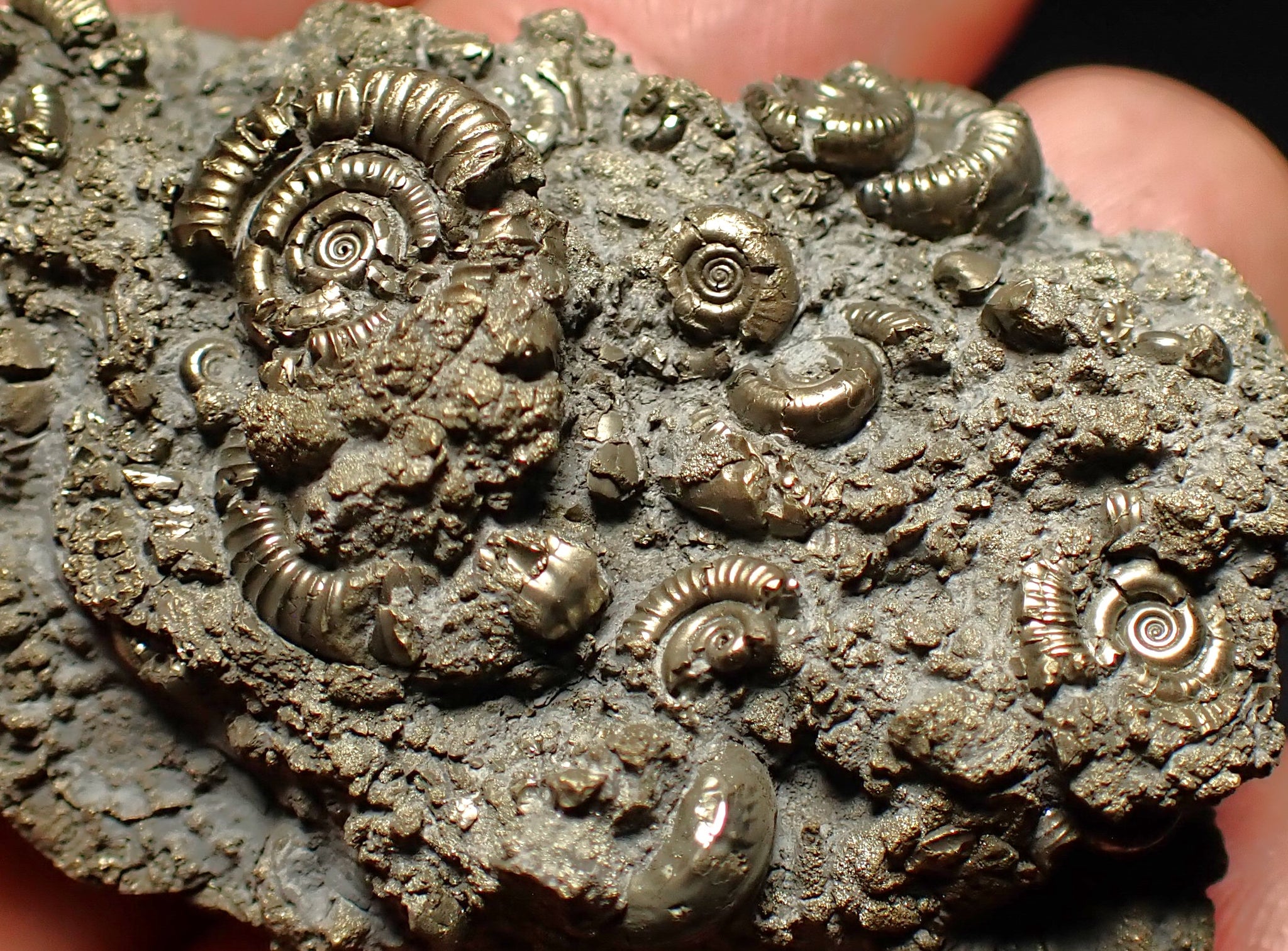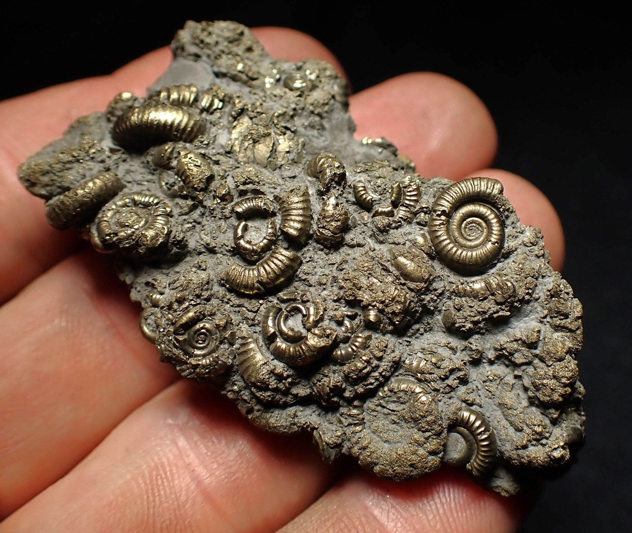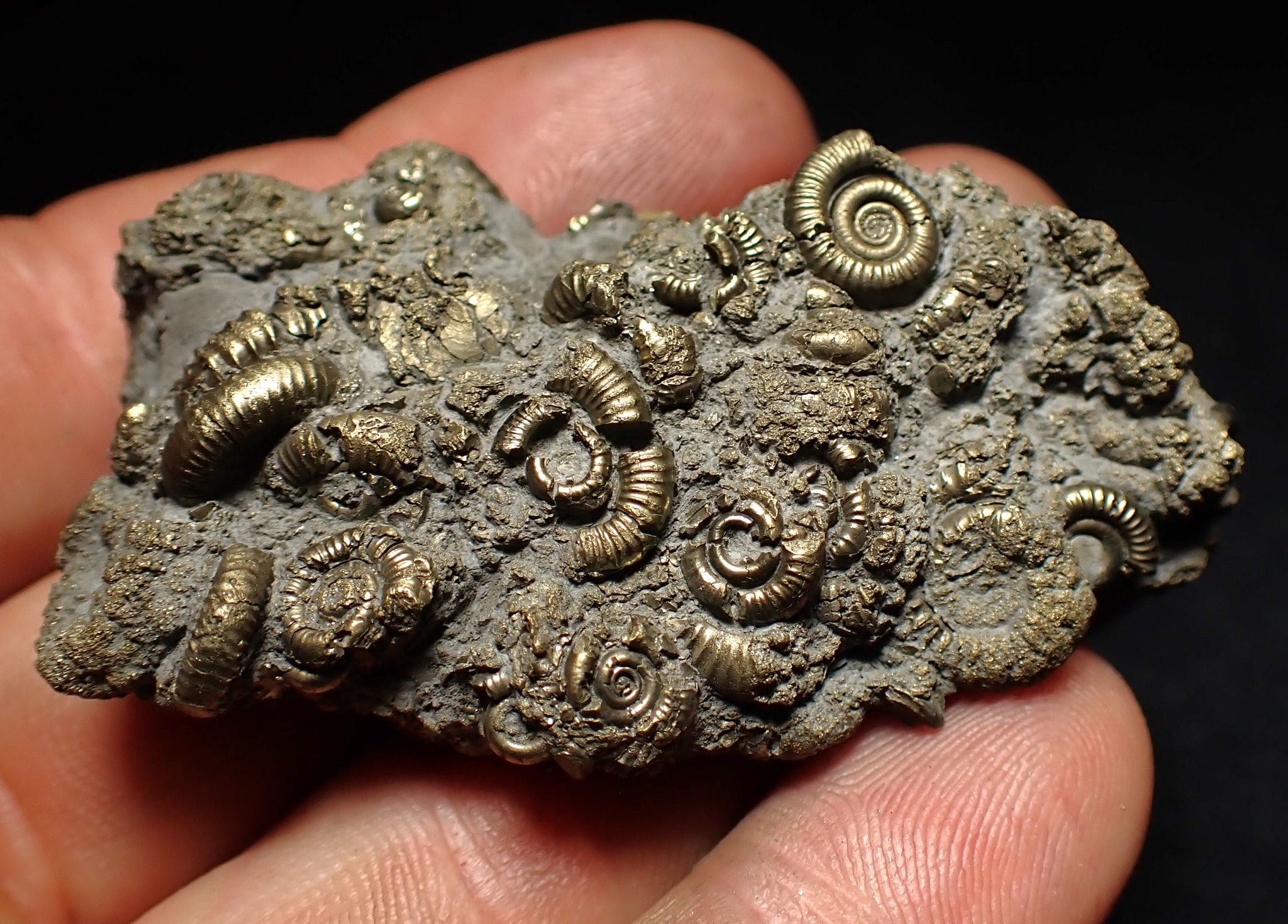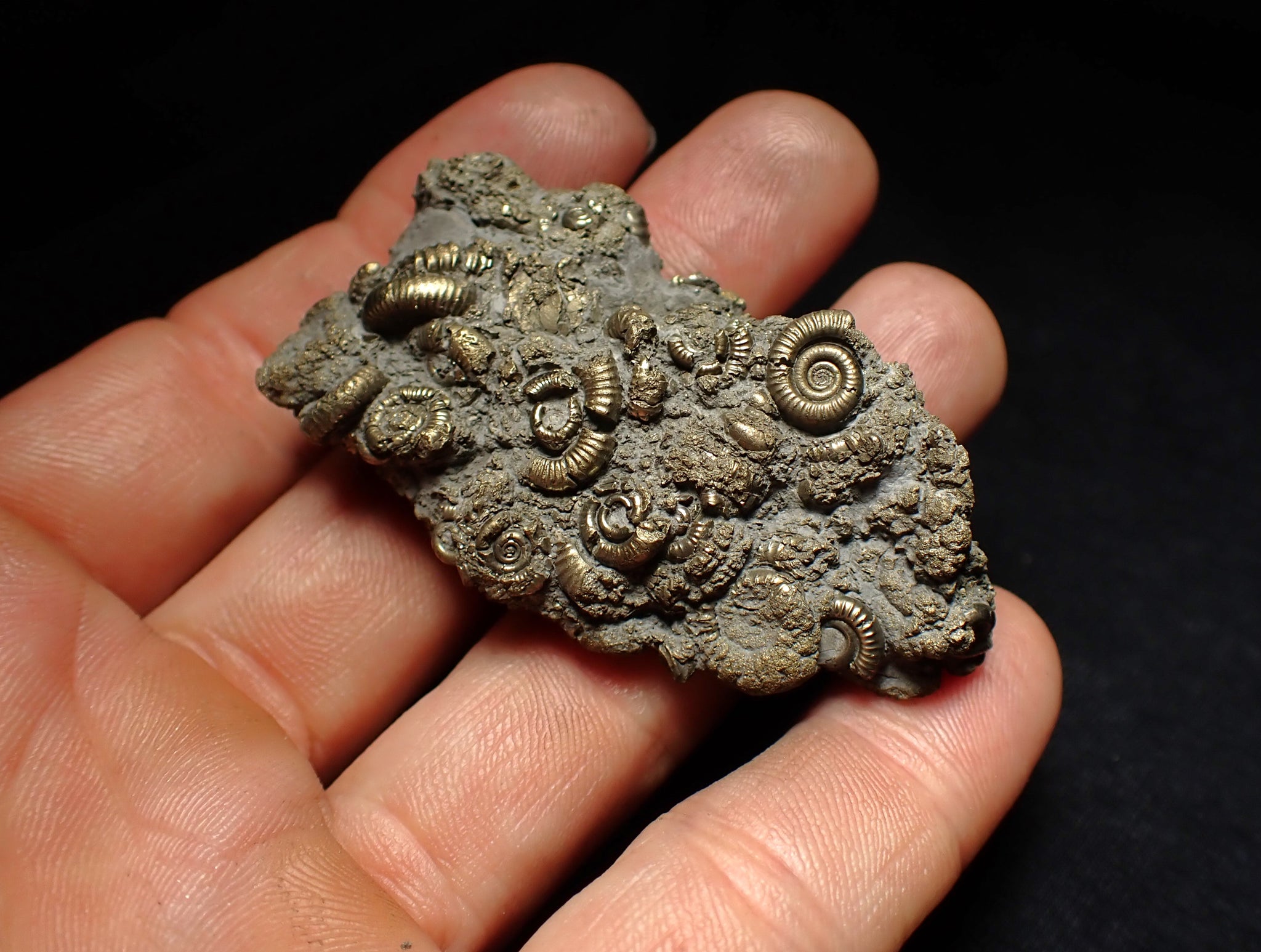 The fossil measures 60 mm (2.4 inches) across with matrix which is large for this type of fossil. The pyrite matrix contains lots of small ammonite shells which all accumulated together on the seafloor in the Early Jurassic. The ammonites are very well preserved with great detail and the whole piece has a wonderful pyritic colour and shine. These beautiful fossils are getting much harder to find. A really unique piece.