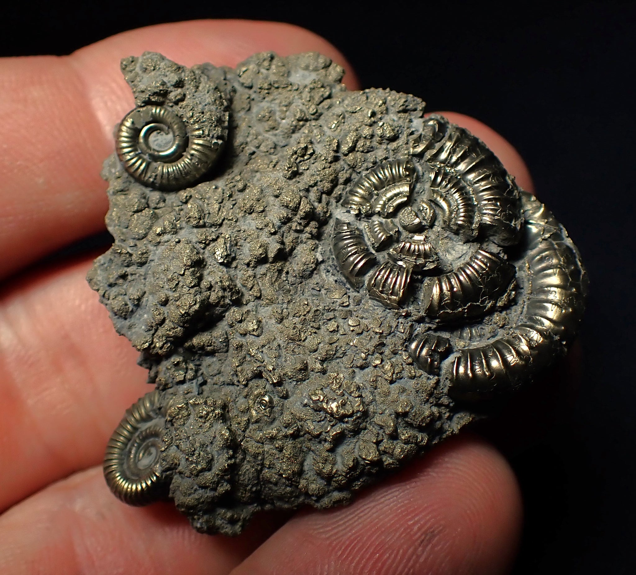 The fossil measures 43 mm (1.72 inches) across with matrix. The pyrite matrix of this piece contains multiple little ammonite shells that accumulated together on the seafloor in the Early Jurassic. The shells are very well preserved with great detail and the whole piece has a wonderful pyritic metallic colour and shine. A small but beautiful fossil.