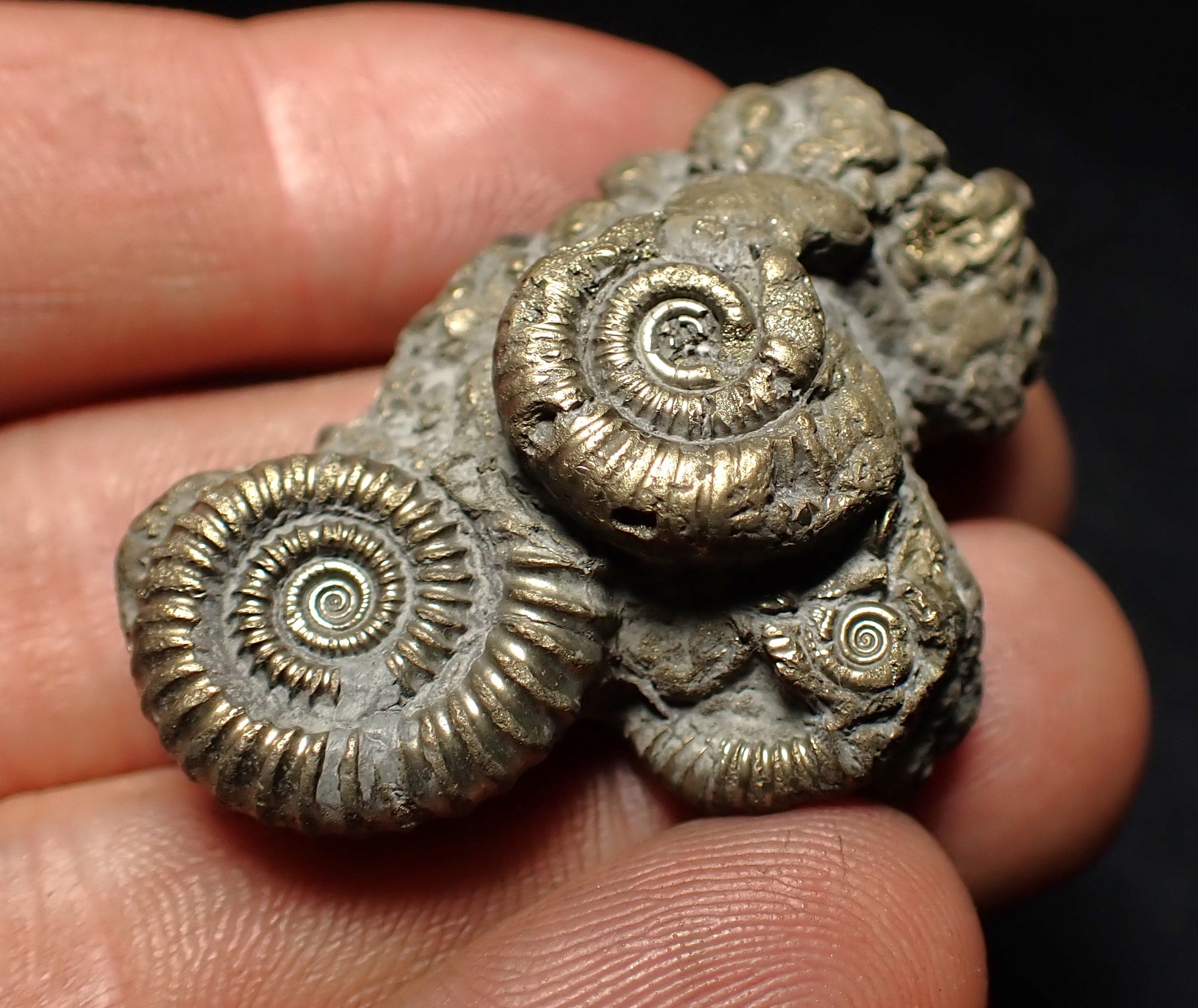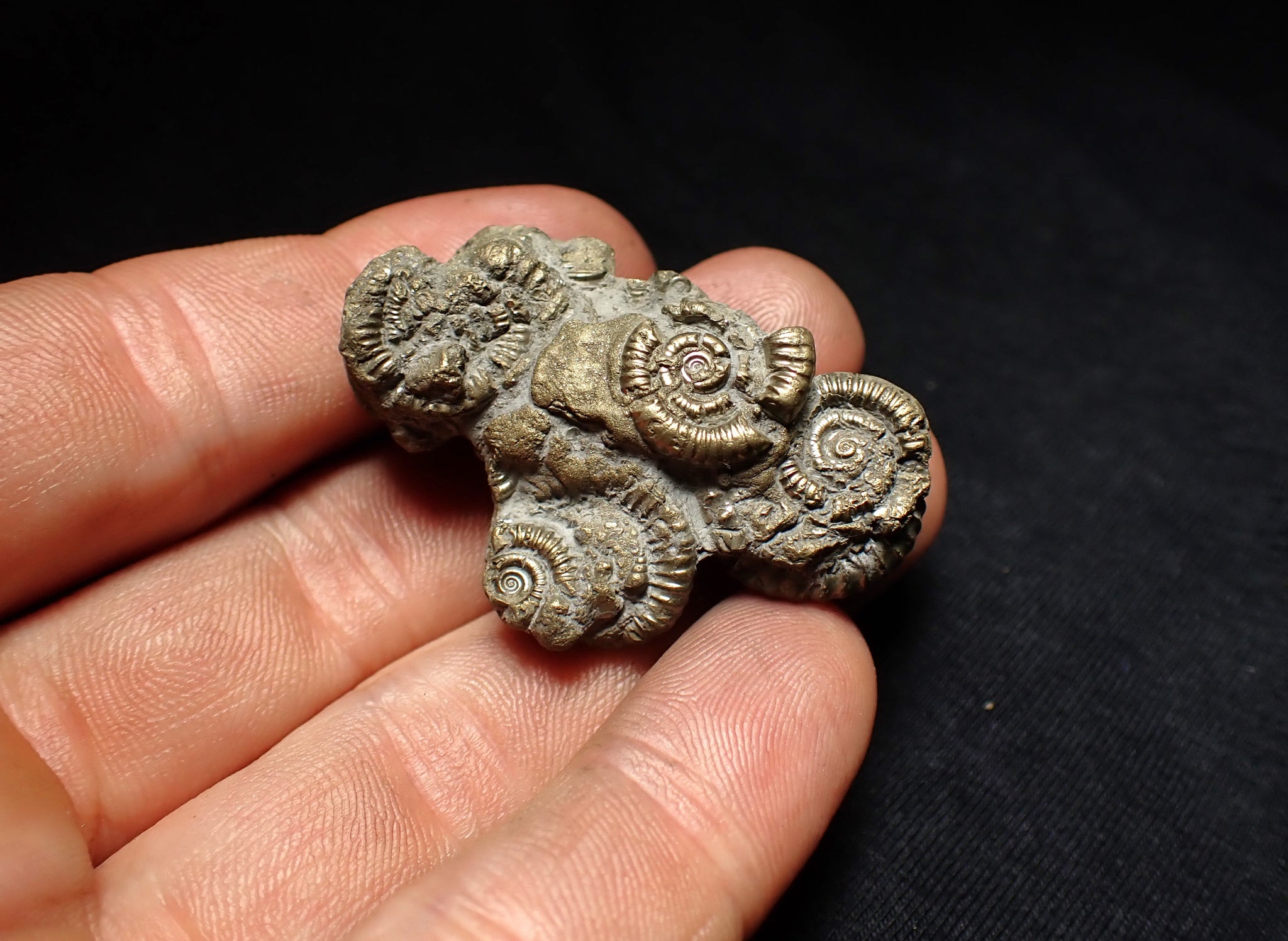 The fossil measures 45 mm (1.8 inches) across with matrix which is a good size for this type of fossil. The pyrite matrix contains lots of small ammonite shells which all accumulated together on the seafloor in the Early Jurassic. The ammonites are very well preserved with great detail and the whole piece has a wonderful pyritic colour and shine. These beautiful fossils are getting much harder to find. A really unique piece.