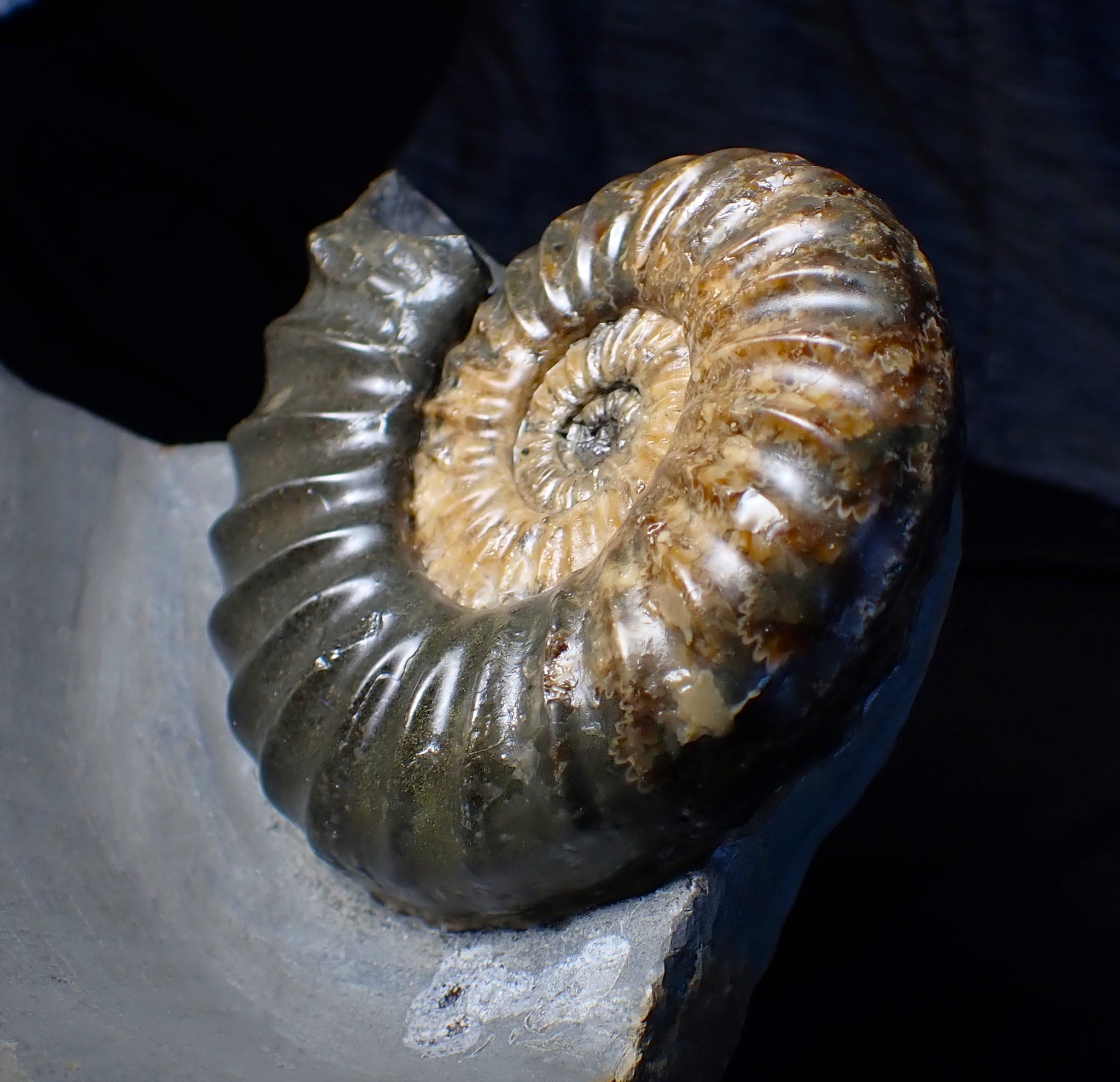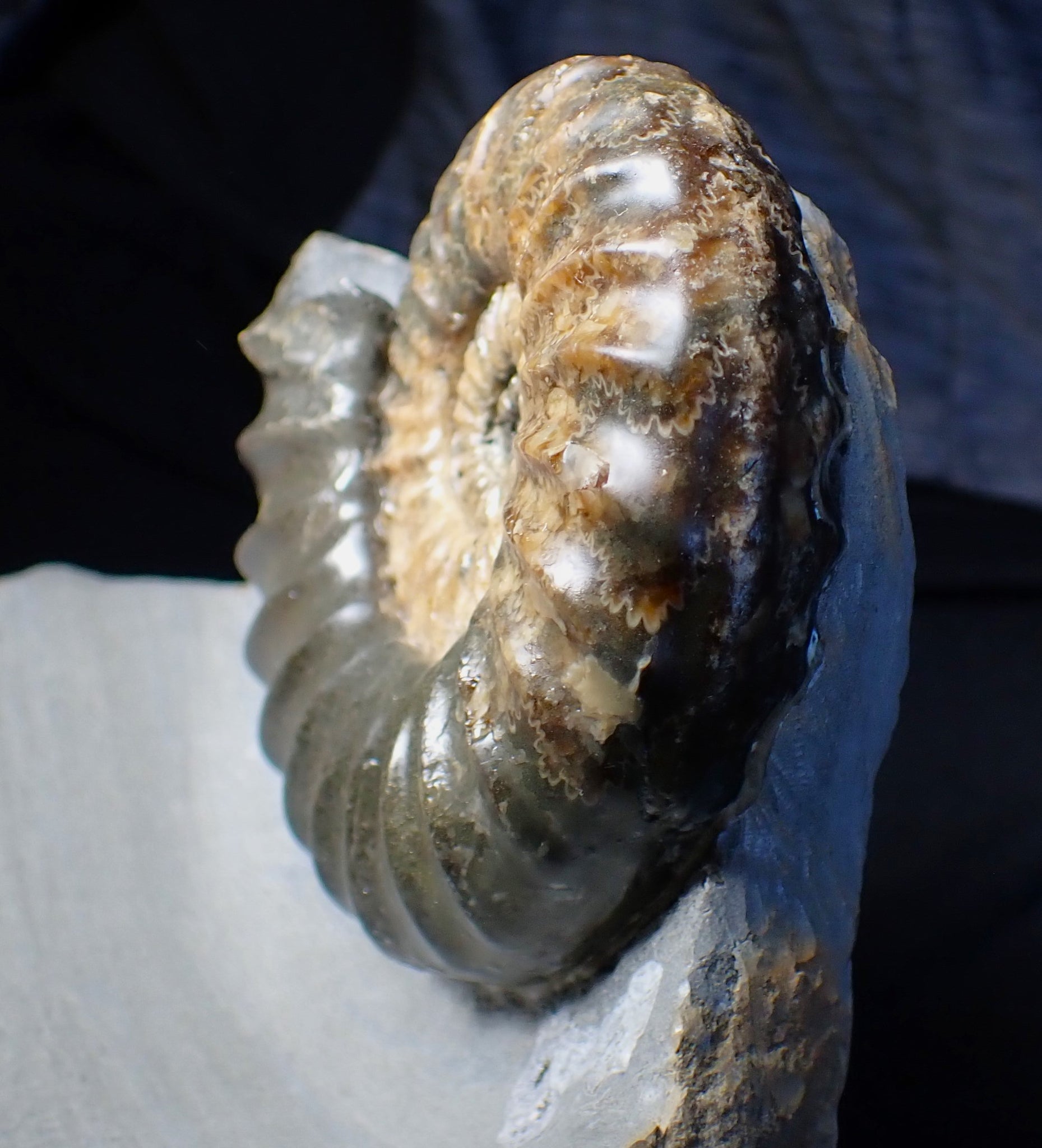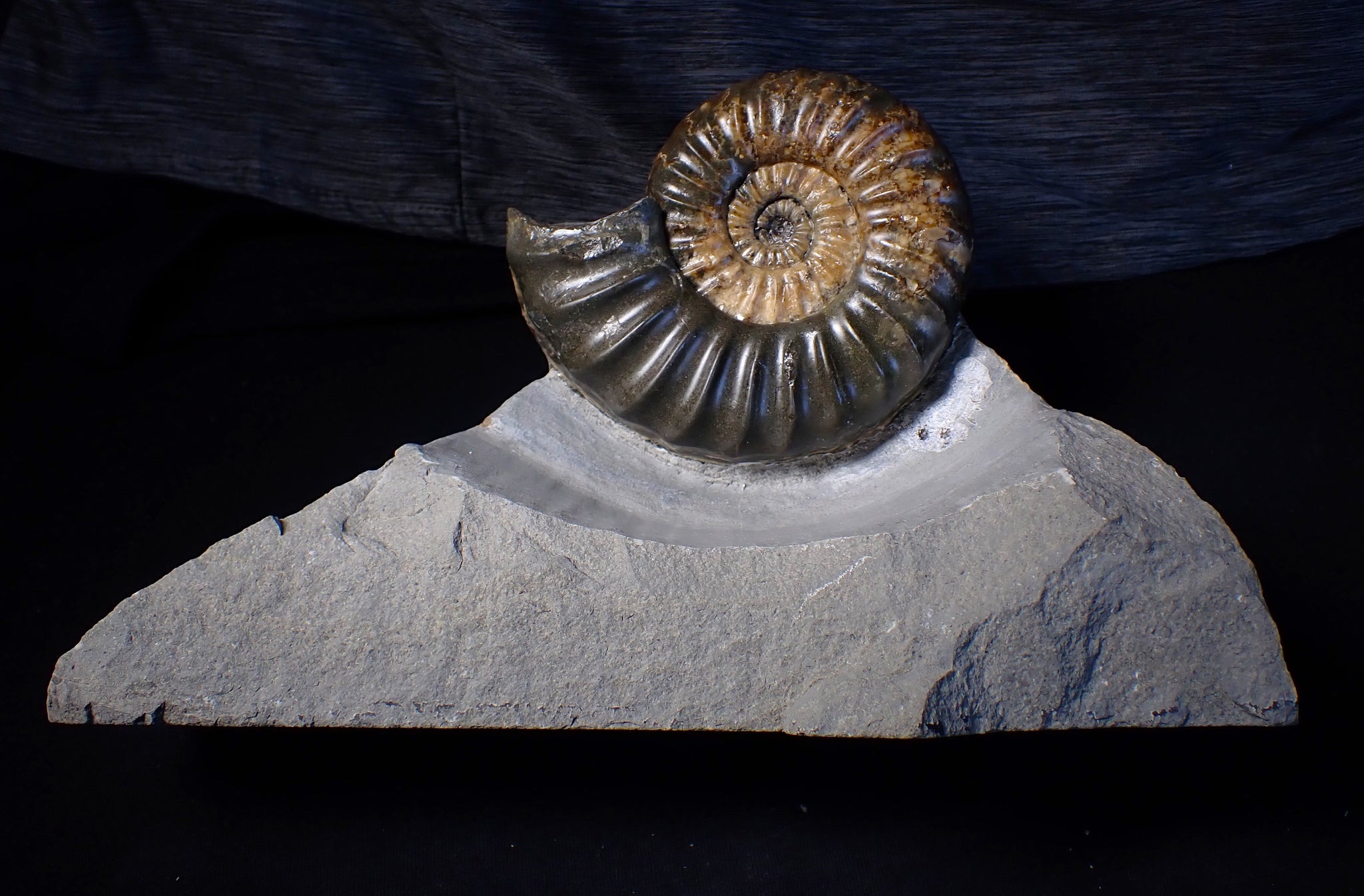 The piece of limestone matrix measures 212 mm (8.35 inches) across and the fossil ammonite measures 98 mm (3.85 inches). The ammonite is well preserved and has been sculpturally prepared out of the rock to reveal the details of the shell. The ribs are very finely defined, and the deep brown and grey colour is beautiful and unusual for these fossils.