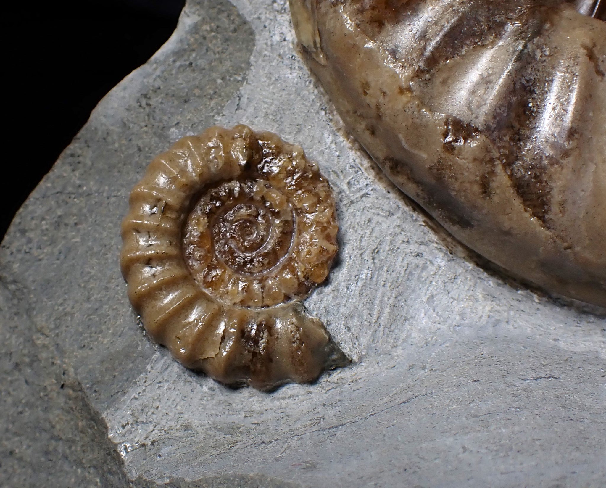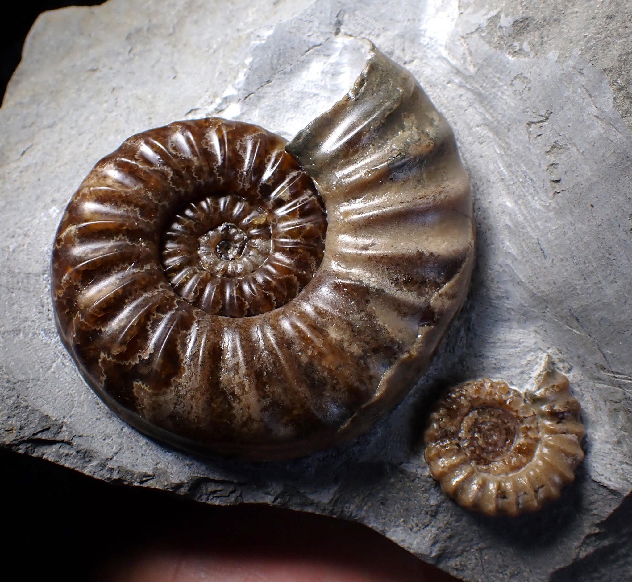The piece of limestone matrix measures 165 mm (6.5 inches) tall and the fossil ammonite measures 77 mm (3.05 inches). The ammonite is well preserved and has been sculpturally prepared out of the rock to reveal the details of the shell. The ribs are very finely defined, and the deep brown colour is beautiful, showing off the intricate suture lines beautifully. There is also a second smaller ammonite of the species Promicroceras planicosta in the matrix.