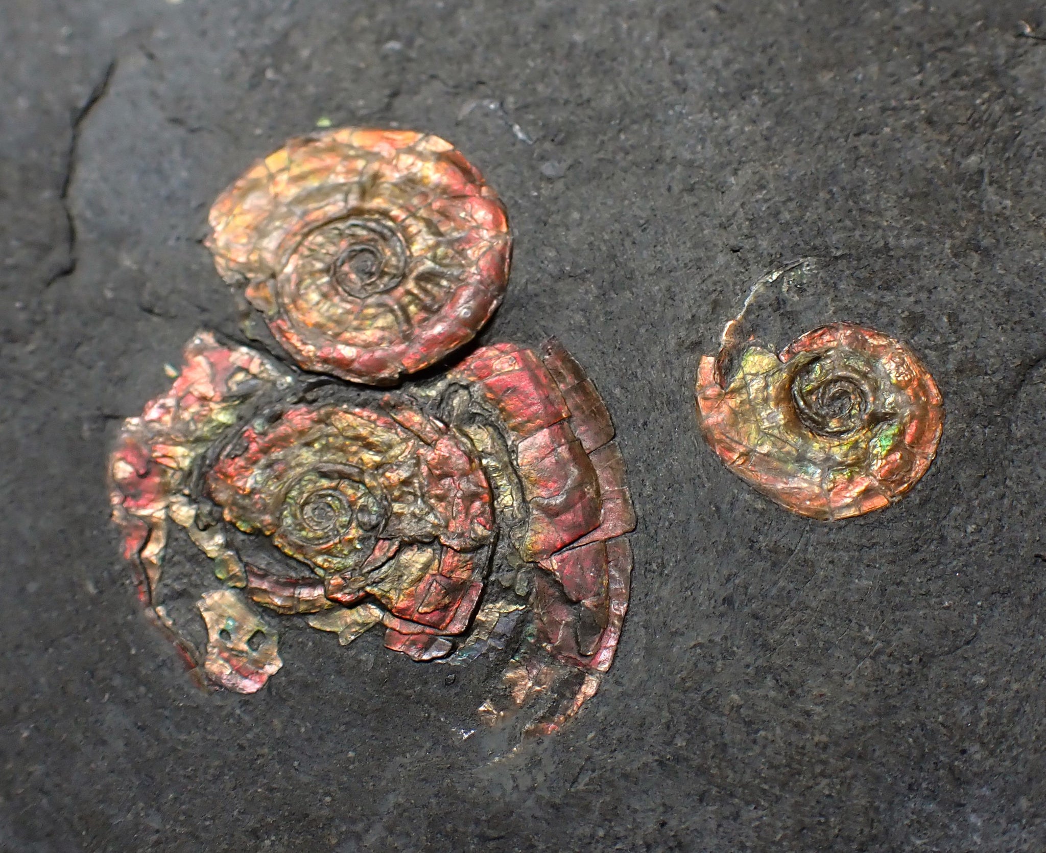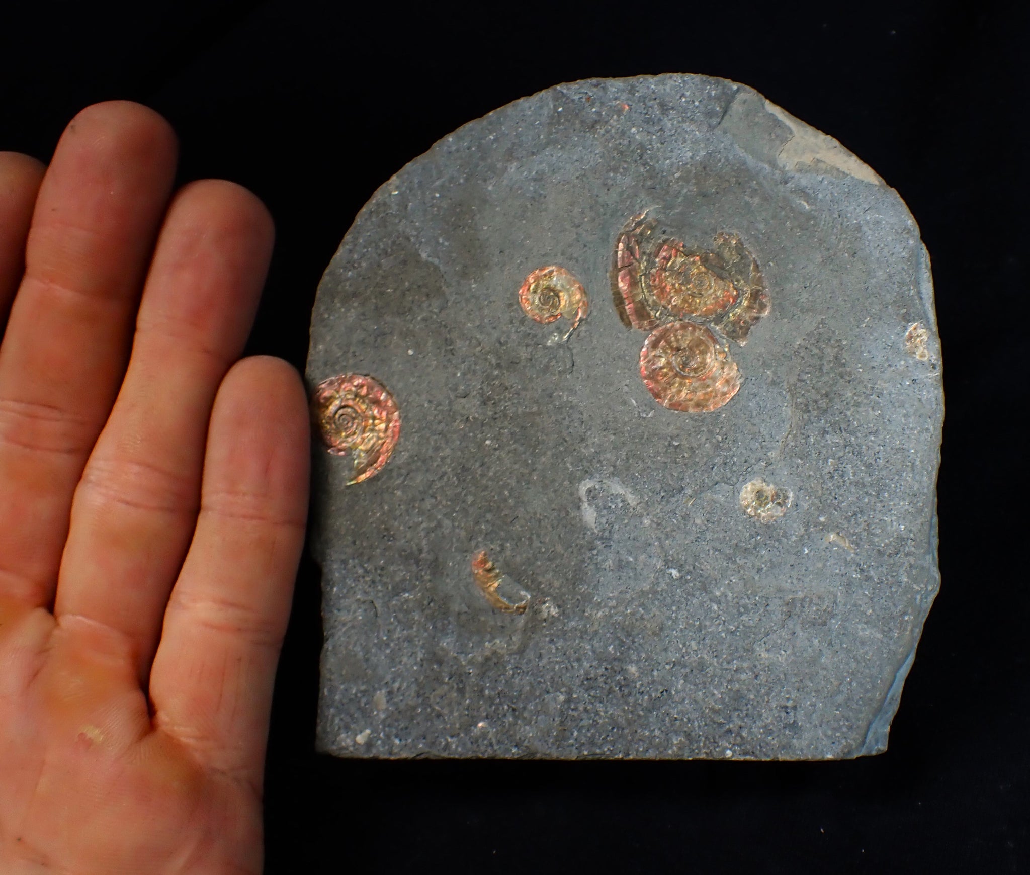 The ammonites are very well preserved and have been prepared out of the rock to reveal the full shells, which display some beautiful iridescence with colours that change as the viewing angle changes, with bright red, copper, and gold colours dominating. The whole piece weighs 348 grams.