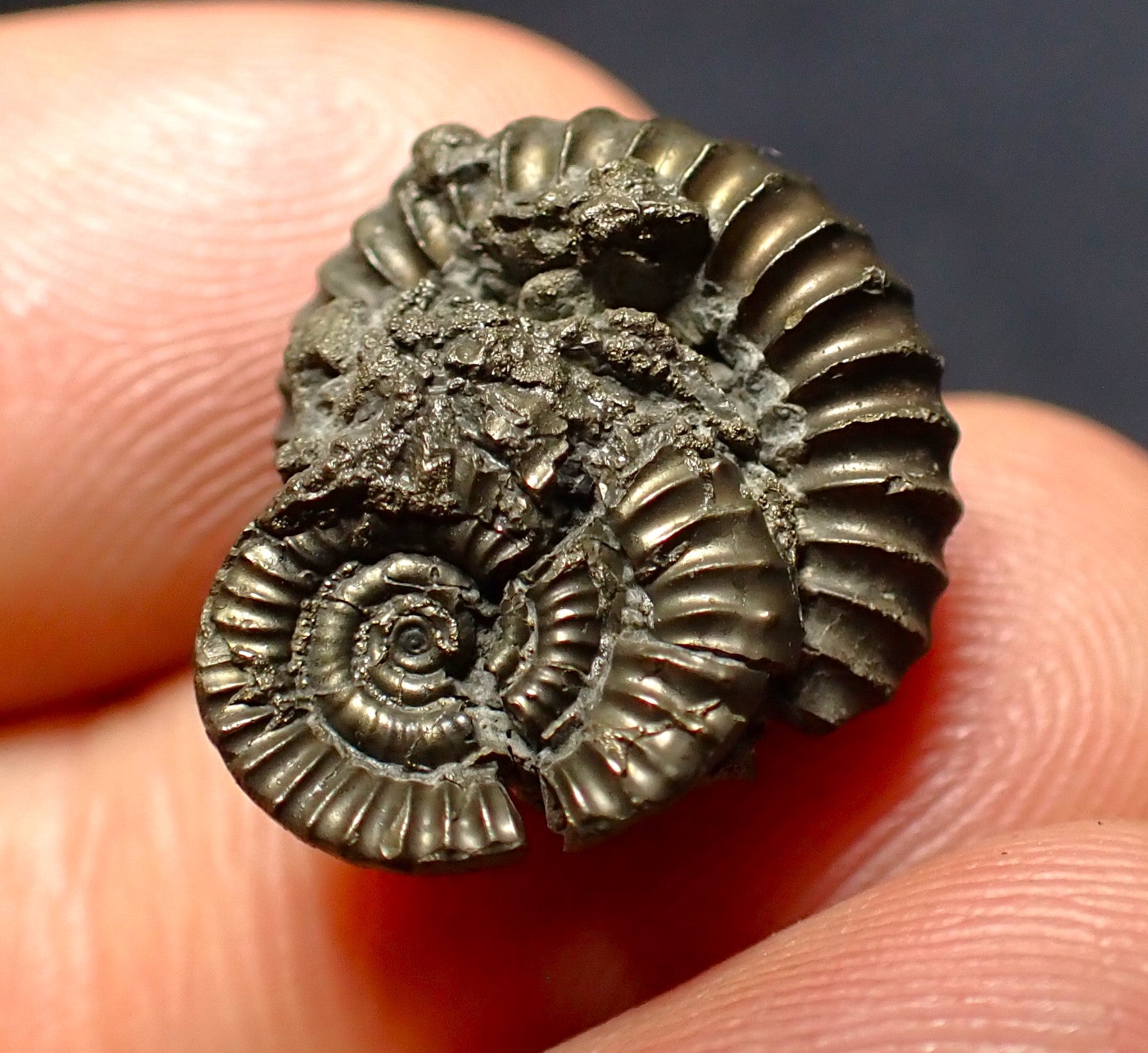 The fossil measures 17 mm (0.68 inches) across. The ammonite shell is very well preserved with great detail in the ribbing. It has a beautiful pyritic metallic shine and a second smaller ammonite on the back.
