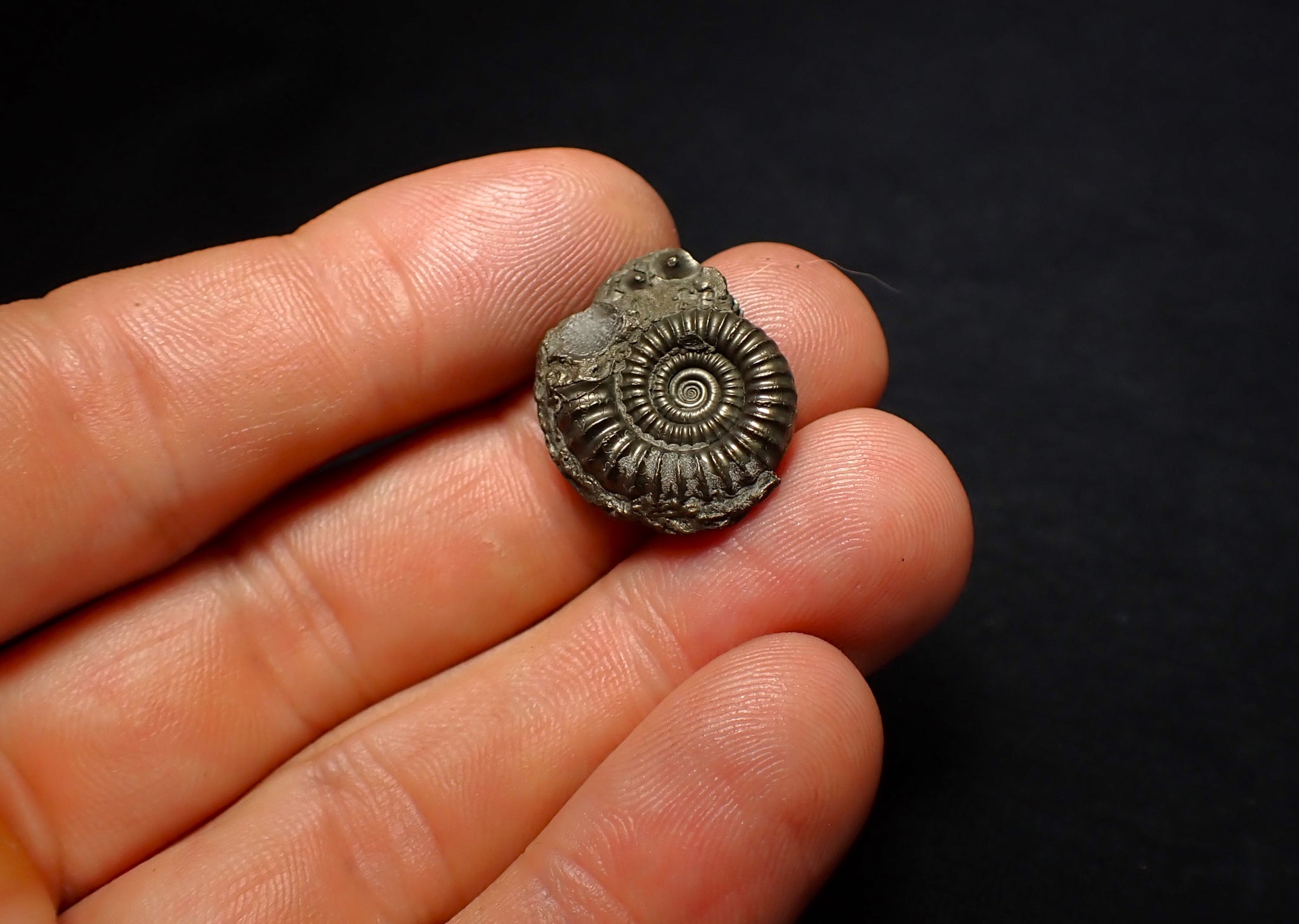 The fossil measures 21 mm (0.85 inches) across. The ammonite shell is very well preserved with great detail in the ribbing. It has a beautiful pyritic metallic shine.