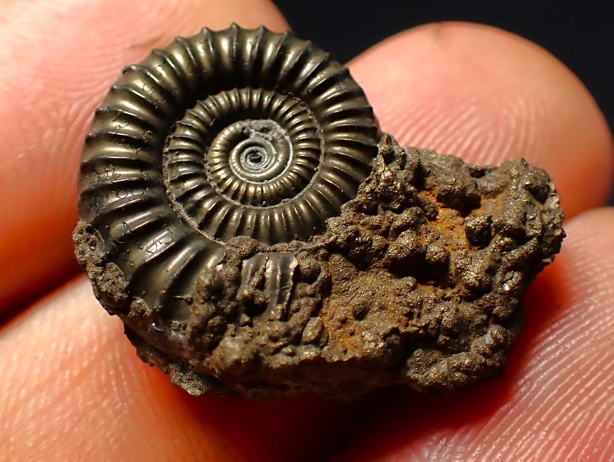 The fossil measures 24 mm (0.98 inches) across with matrix, which is a good size for this species. The ammonite shell is very well preserved with great detail in the ribbing and it has a wonderful metallic shine.