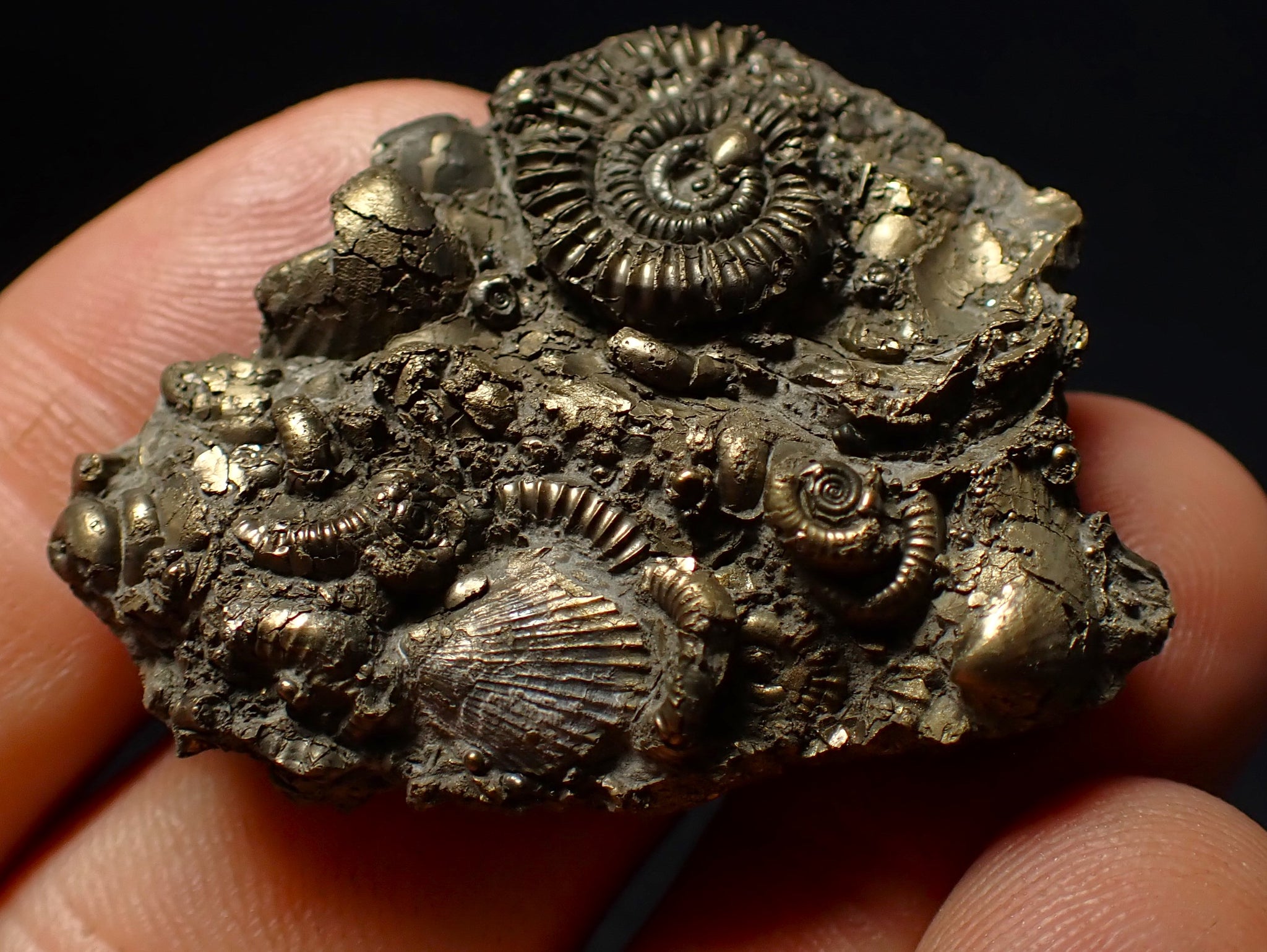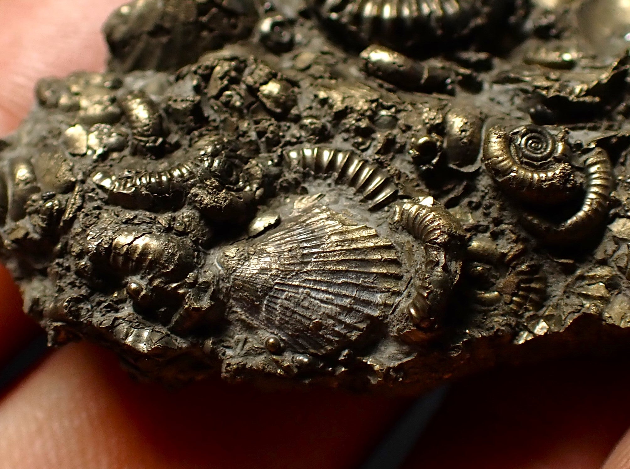 The fossil measures 42 mm (1.7 inches) across with matrix. The pyrite matrix contains lots of small ammonite and bivalve shells which all accumulated together on the seafloor in the Early Jurassic. This is one of the very best examples of this fossil type we have come across.