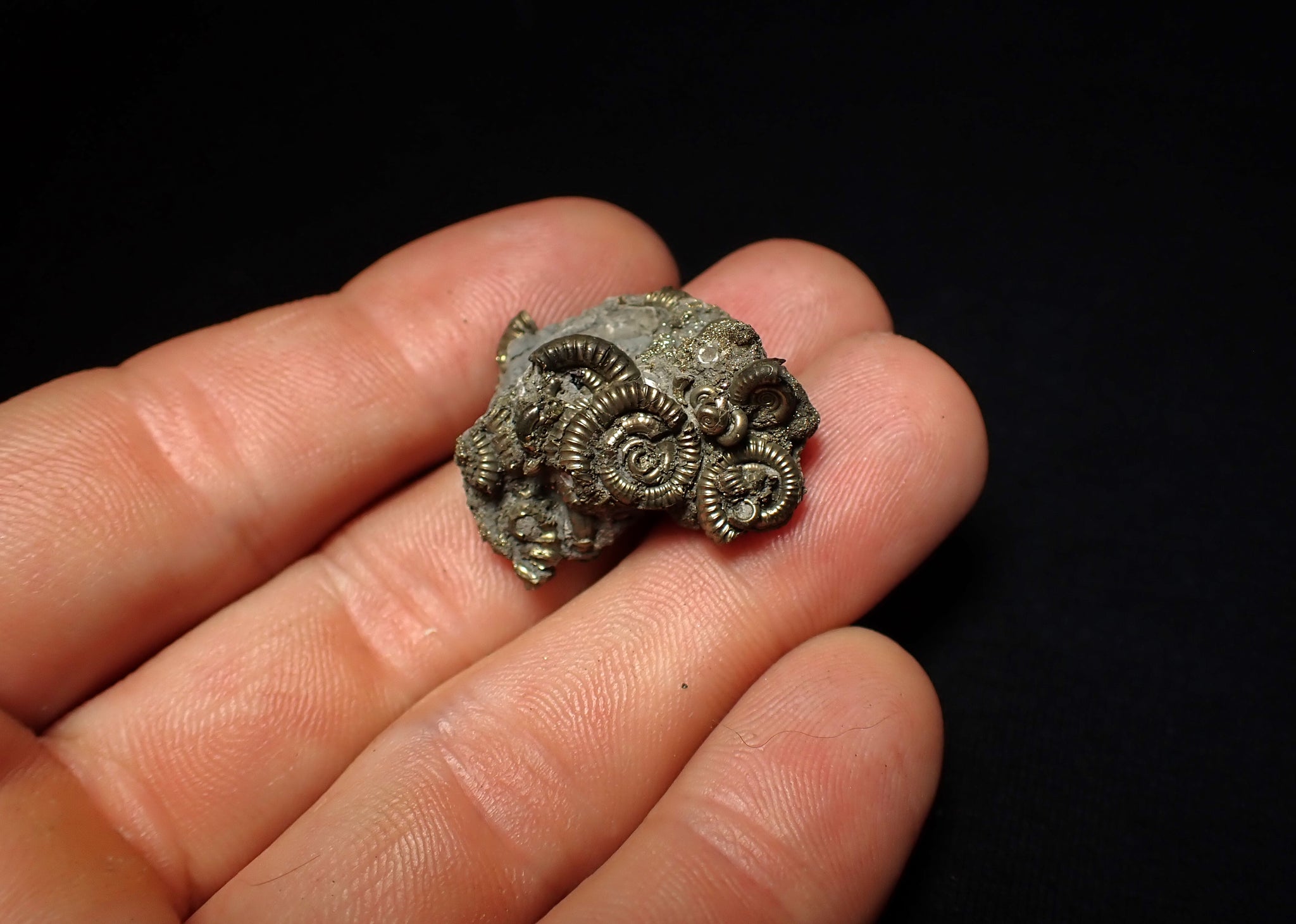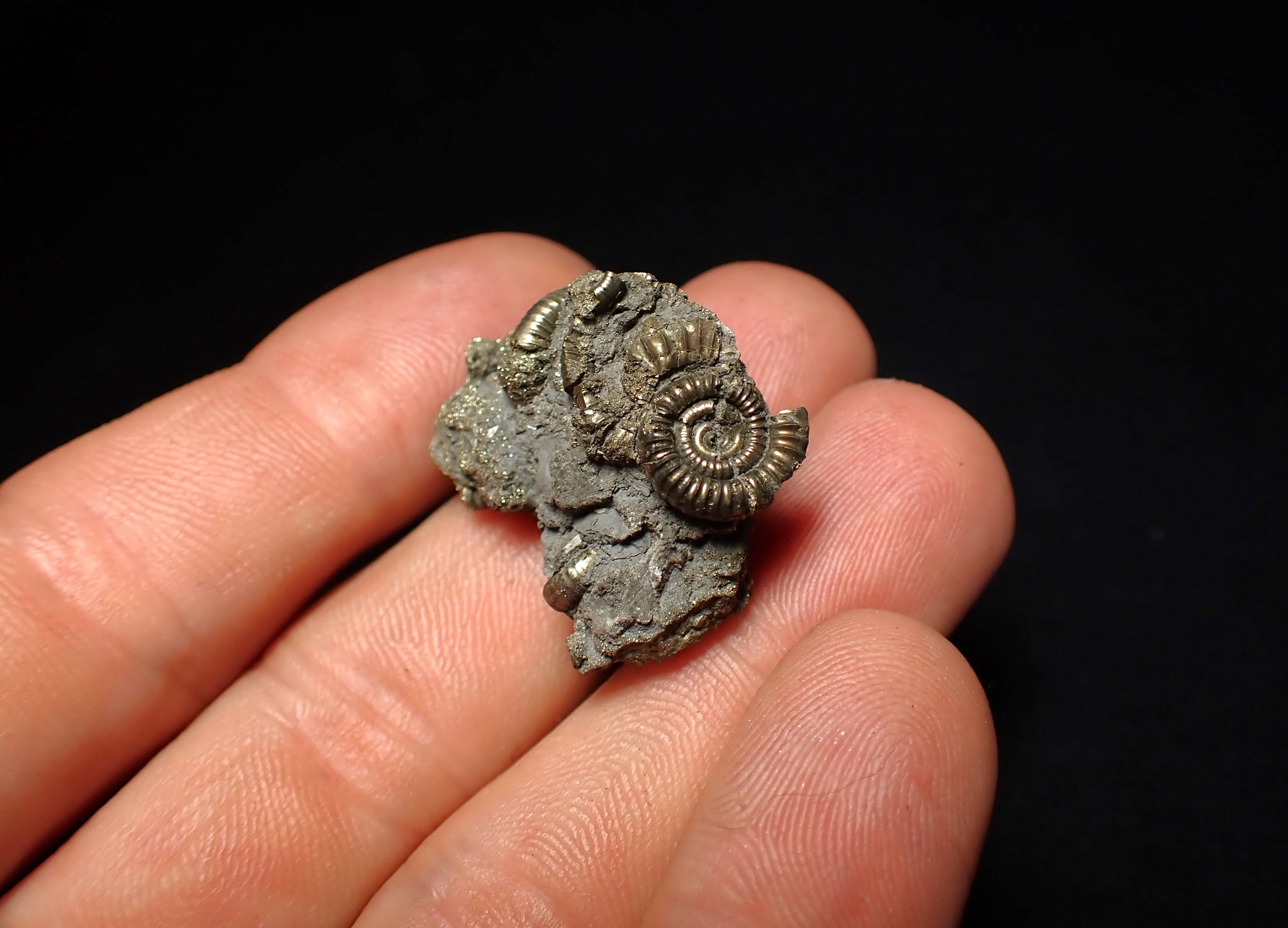 The fossil measures 27 mm (1.1 inches) across with matrix, making it a small fossil packed full of detail. The pyrite matrix contains lots of tiny ammonite shells which all accumulated together on the seafloor in the Early Jurassic. Some of the shells are just a few millimetres across, making them truly tiny. The ammonites are very well preserved with great detail and the whole piece has a wonderful pyritic colour and shine. These beautiful fossils are getting much harder to find and each one is totally unique.