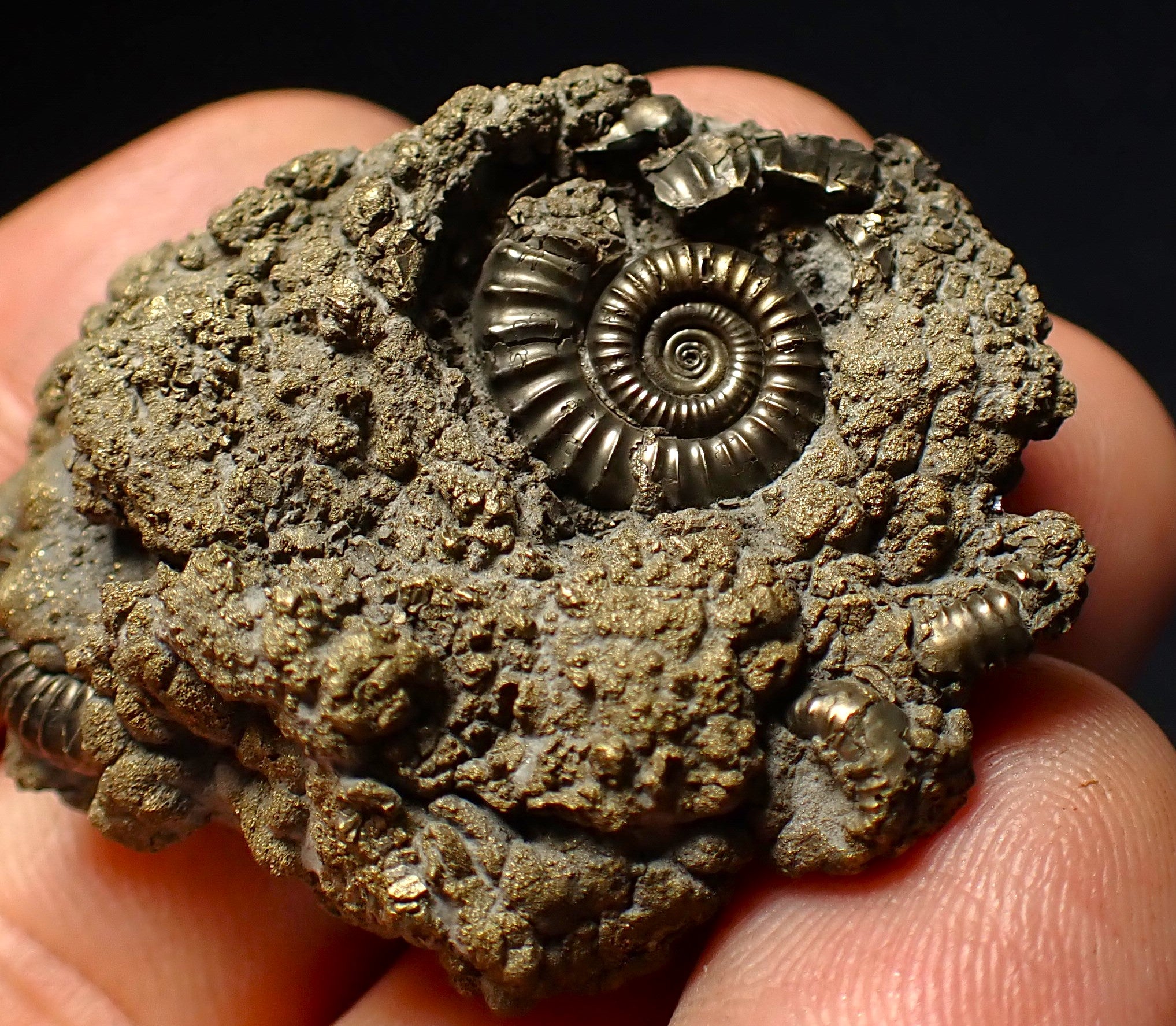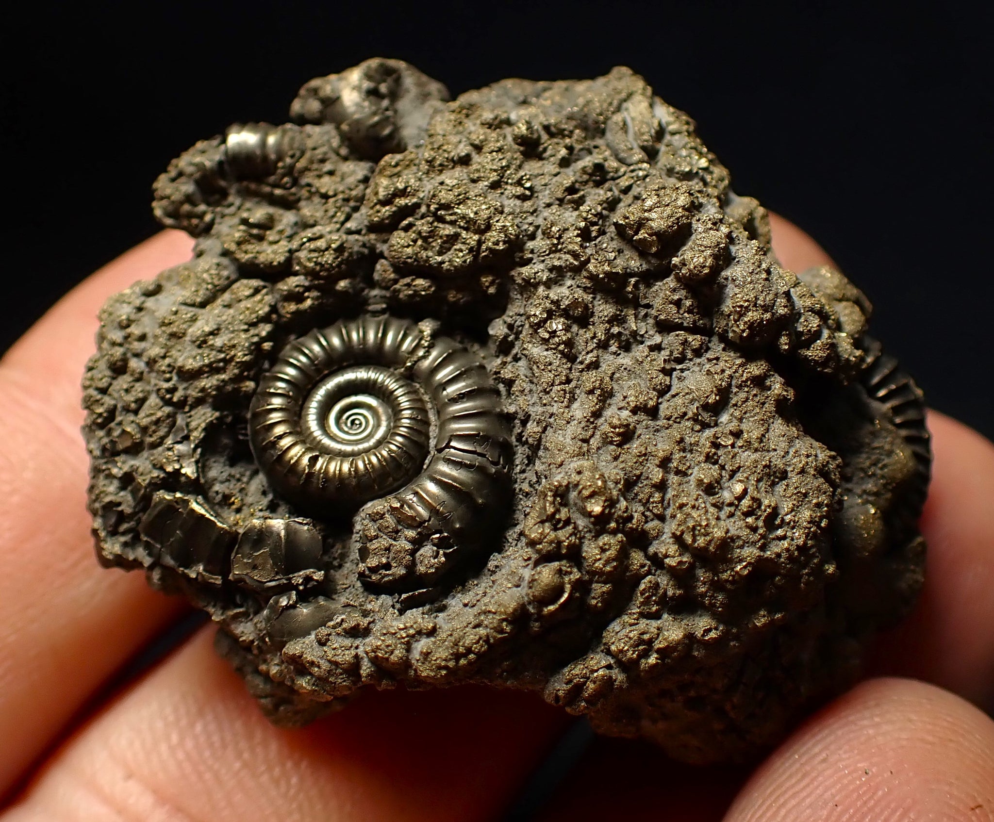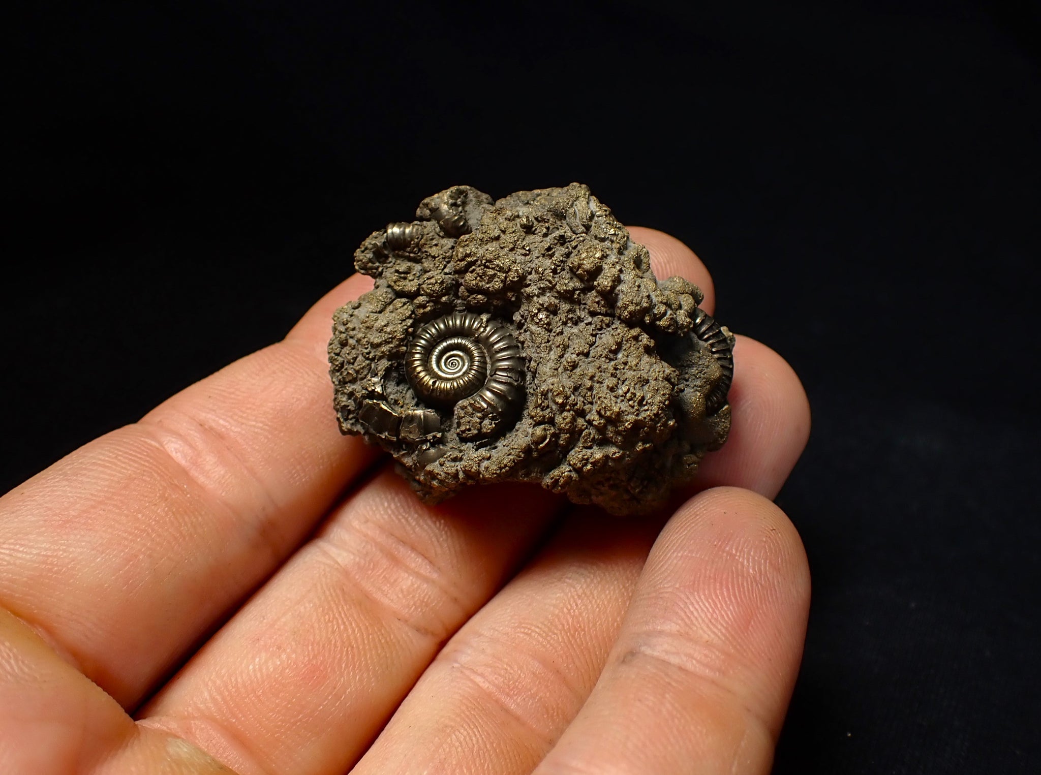 The fossil measures 42 mm (1.65 inches) across with matrix, which is a good size for this fossil type. The pyrite matrix contains lots of small ammonite shells which all accumulated together on the seafloor in the Early Jurassic.