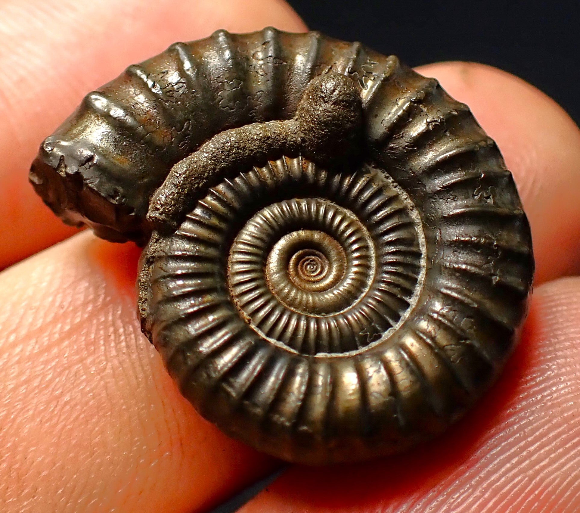 The fossil measures 27 mm (1.1 inches) across, which is large for this species. The ammonite shell is very well preserved with great detail in the ribbing and it has a wonderful metallic shine.