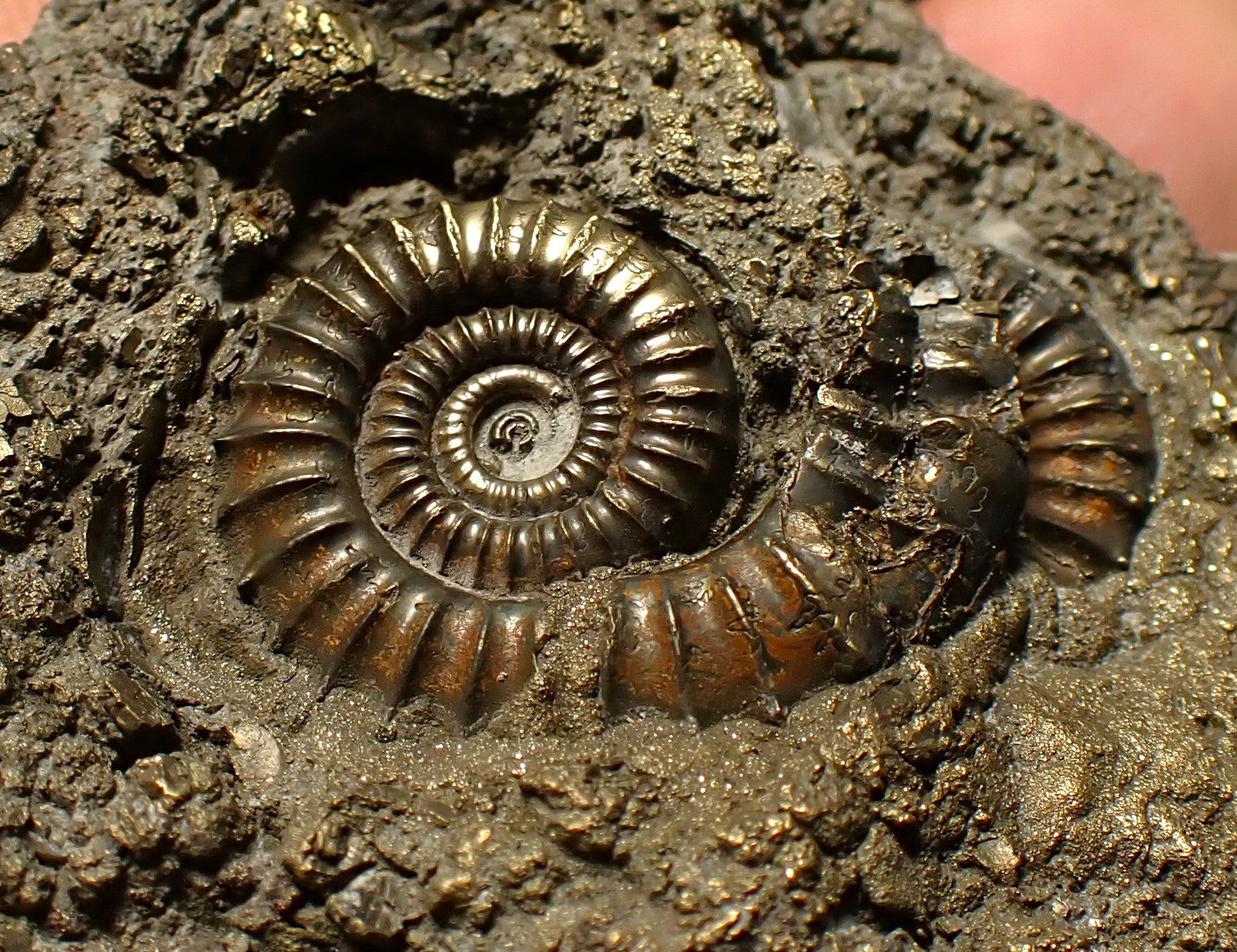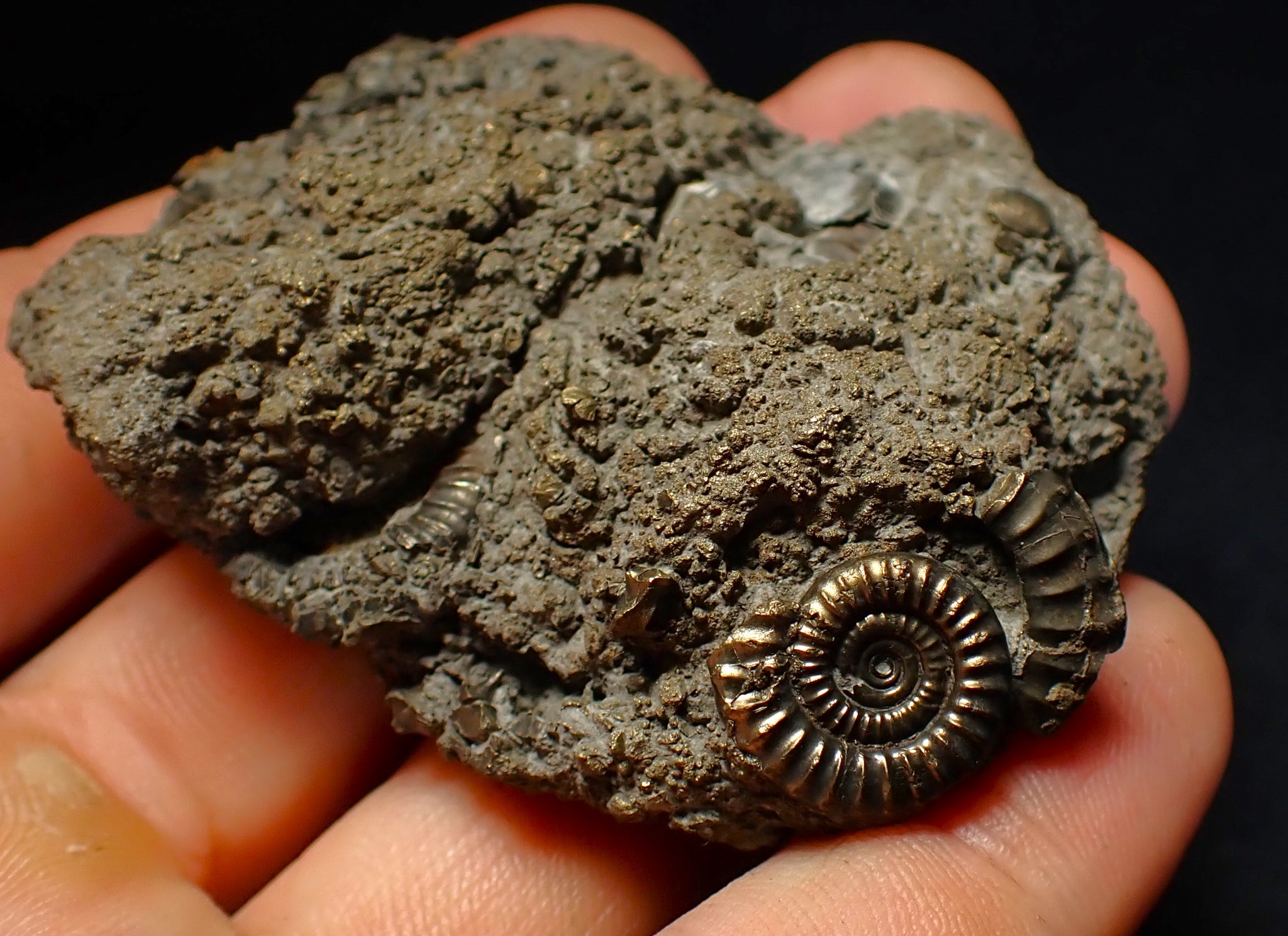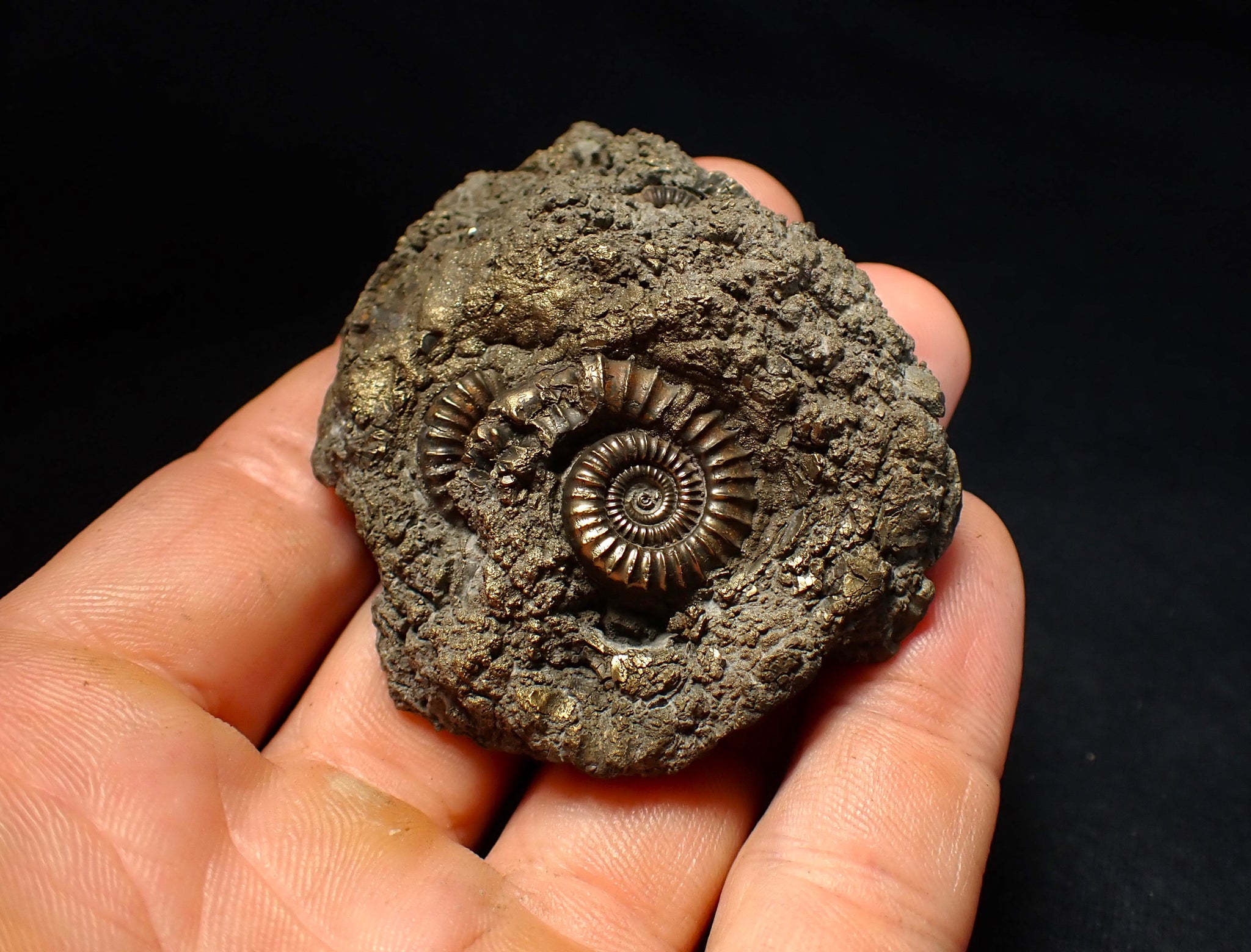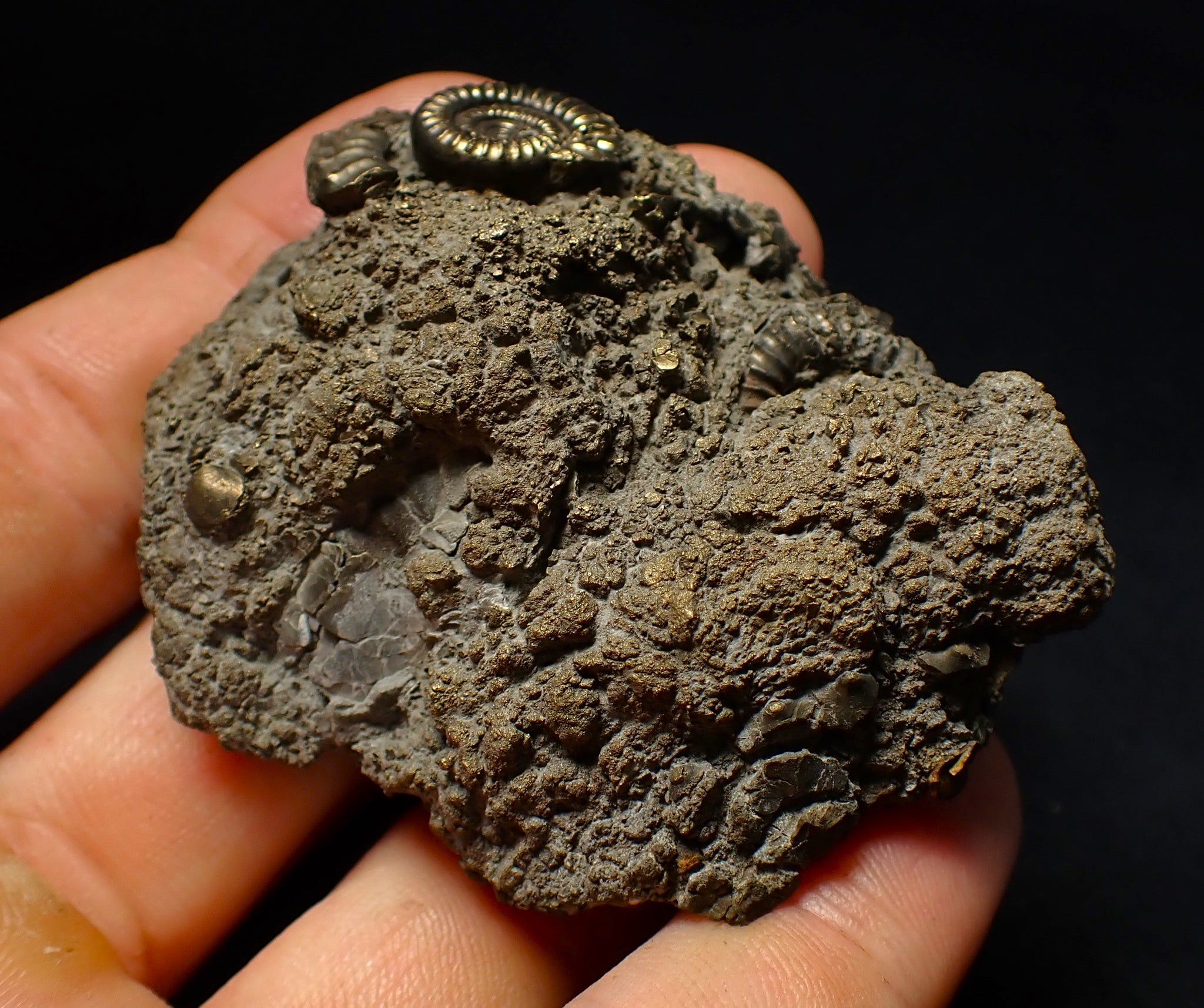 The fossil measures 64 mm (2.5 inches) across with matrix, which is large for this fossil type. The pyrite matrix contains lots of small ammonite shells which all accumulated together on the seafloor in the Early Jurassic. The ammonites are very well preserved with great detail and the whole piece has a wonderful pyritic colour and shine. These beautiful fossils are getting much harder to find. A really unique piece.