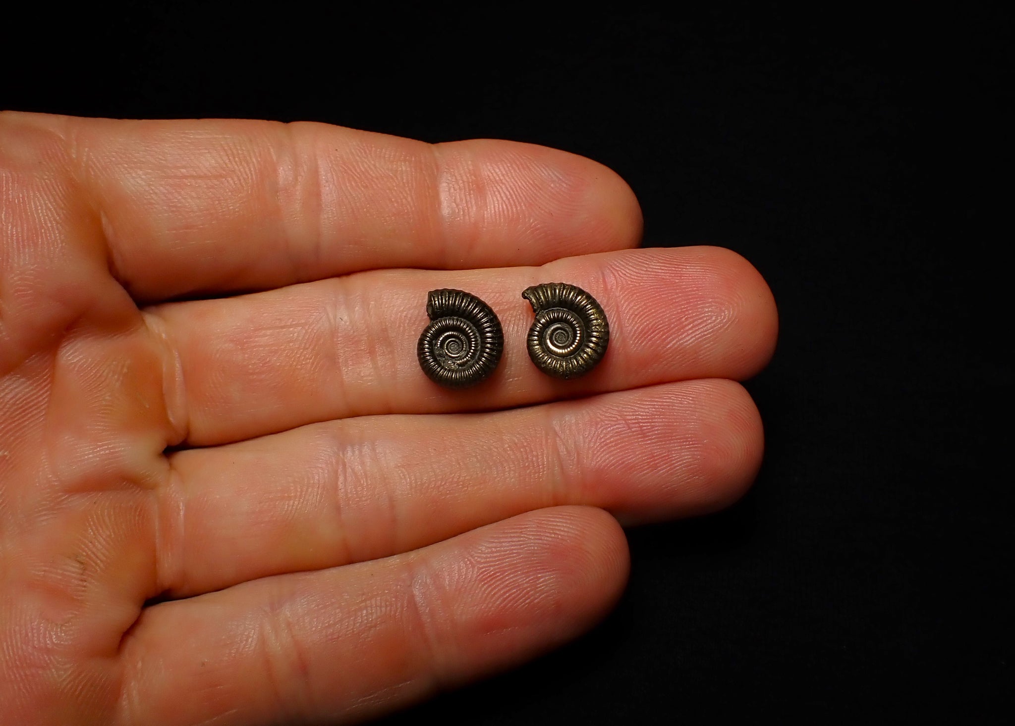 The fossils measure 13 mm (0.5 inches) across. They have been chosen as a matched pair that are of the same size and quality, making them ideal foe jewellery purposes. The ammonite shells are very well preserved with great detail in the ribbing. They have a beautiful pyritic metallic shine.