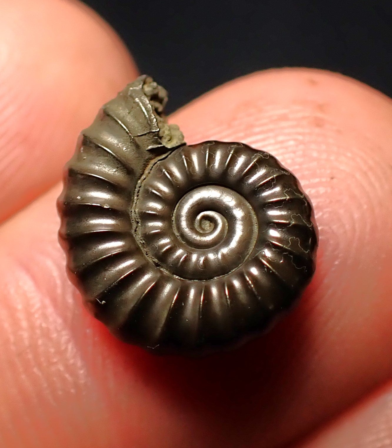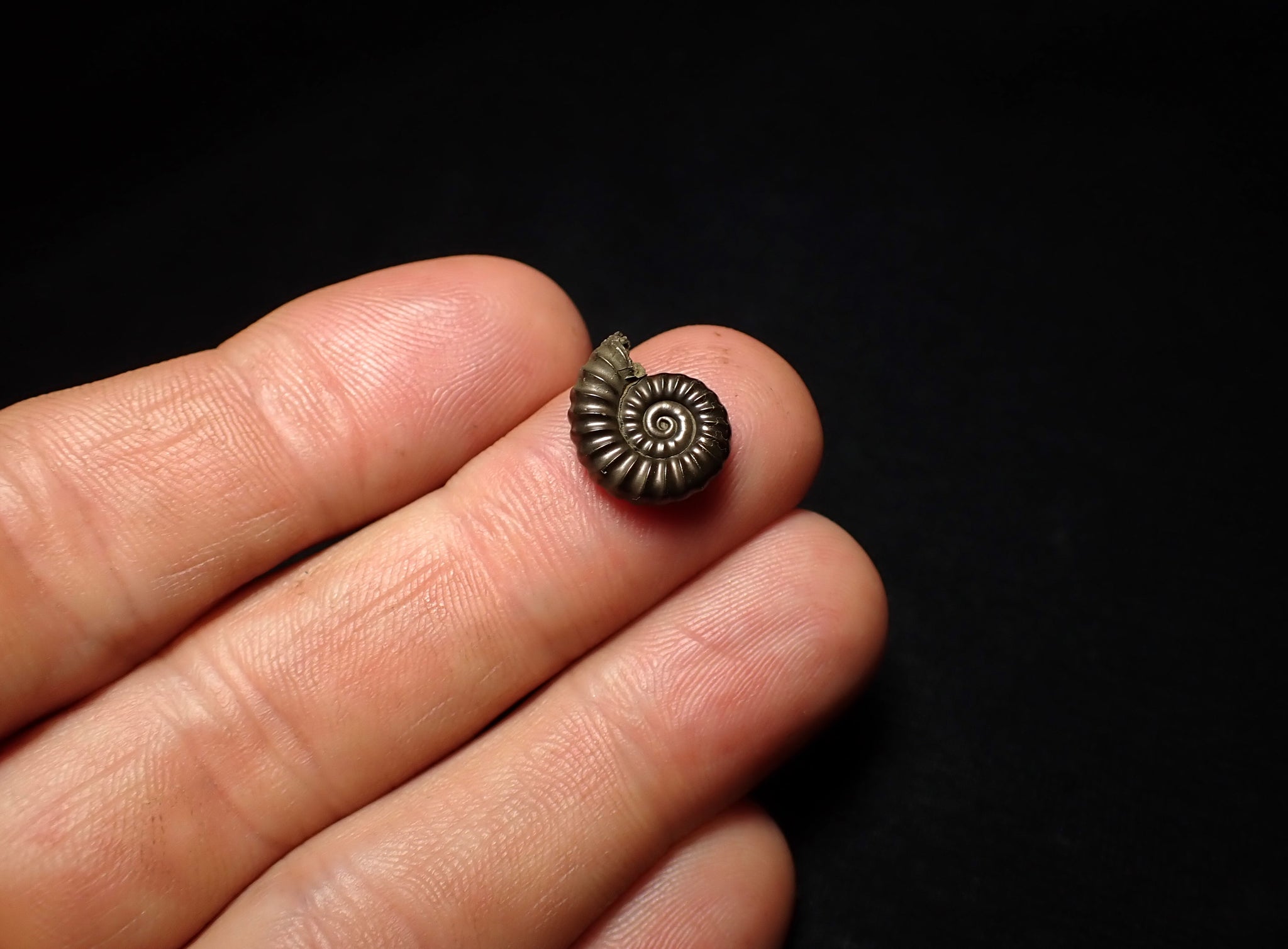 The fossil measures 14 mm (0.56 inches) across. The ammonite is very well preserved on both sides. The ribs are very finely defined and the pyritic colour and shine is beautiful. A great example of the species and incredible in the flesh.