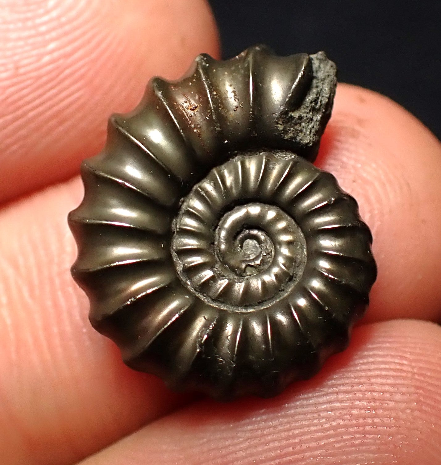 The fossil measures 20 mm (0.8 inches) across, which is a good size for this species. The ammonite is very well preserved on both sides. The ribs are very finely defined and the pyritic colour and shine is beautiful. A great example of the species and incredible in the flesh.