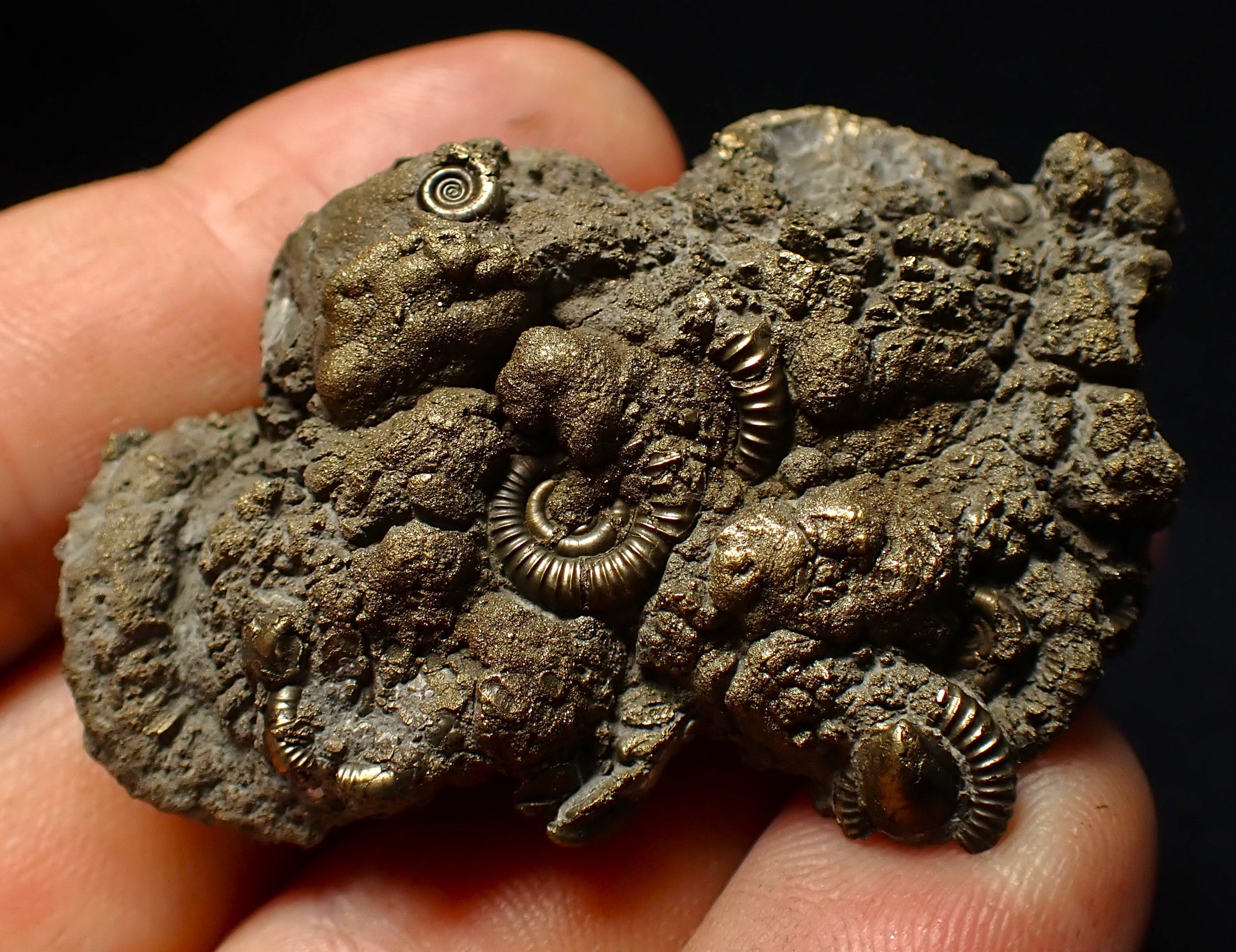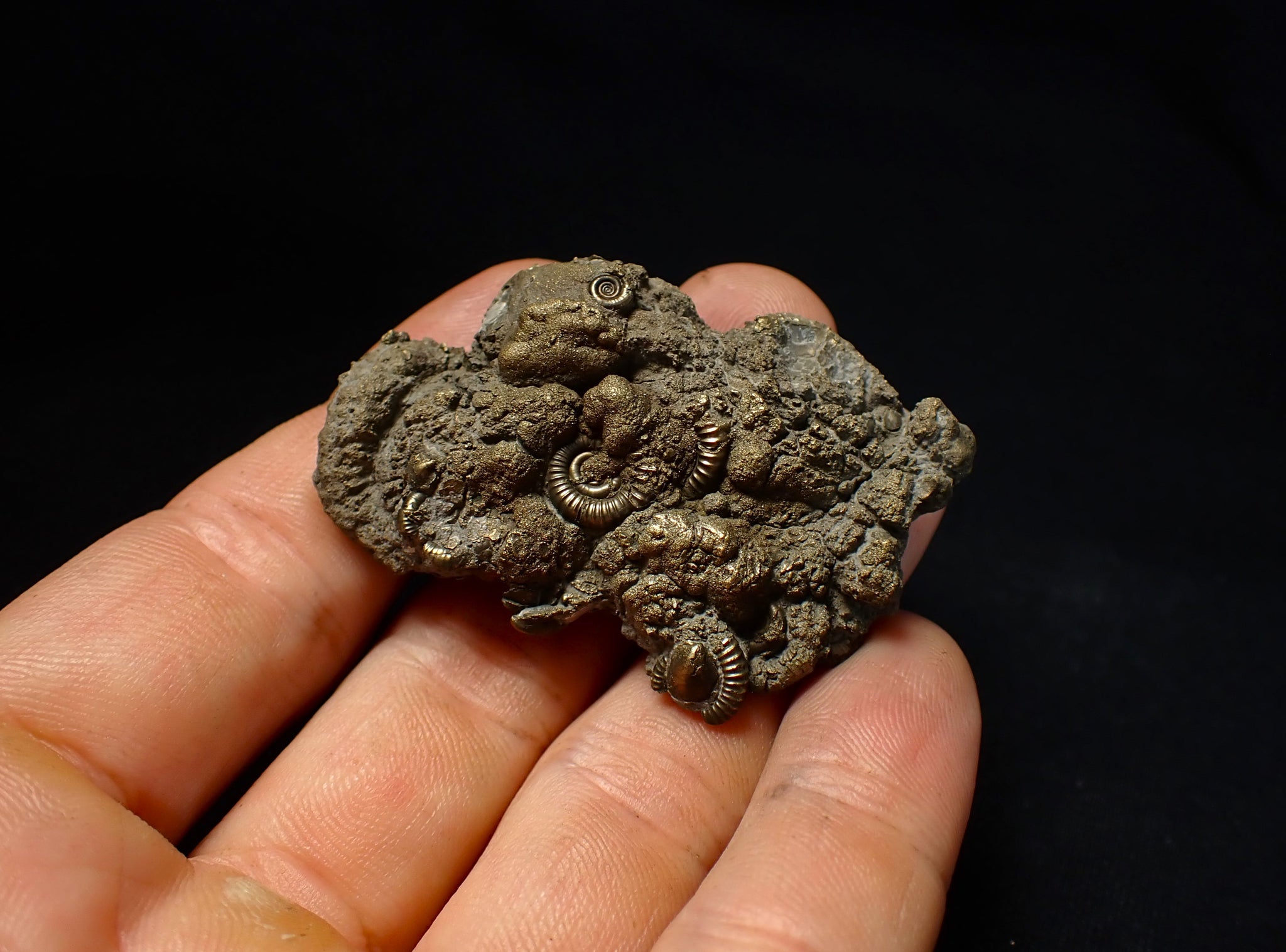 The fossil measures 56 mm (2.22 inches) across with matrix, which is a good size for this fossil type. The pyrite matrix contains lots of small ammonite shells which all accumulated together on the seafloor in the Early Jurassic.