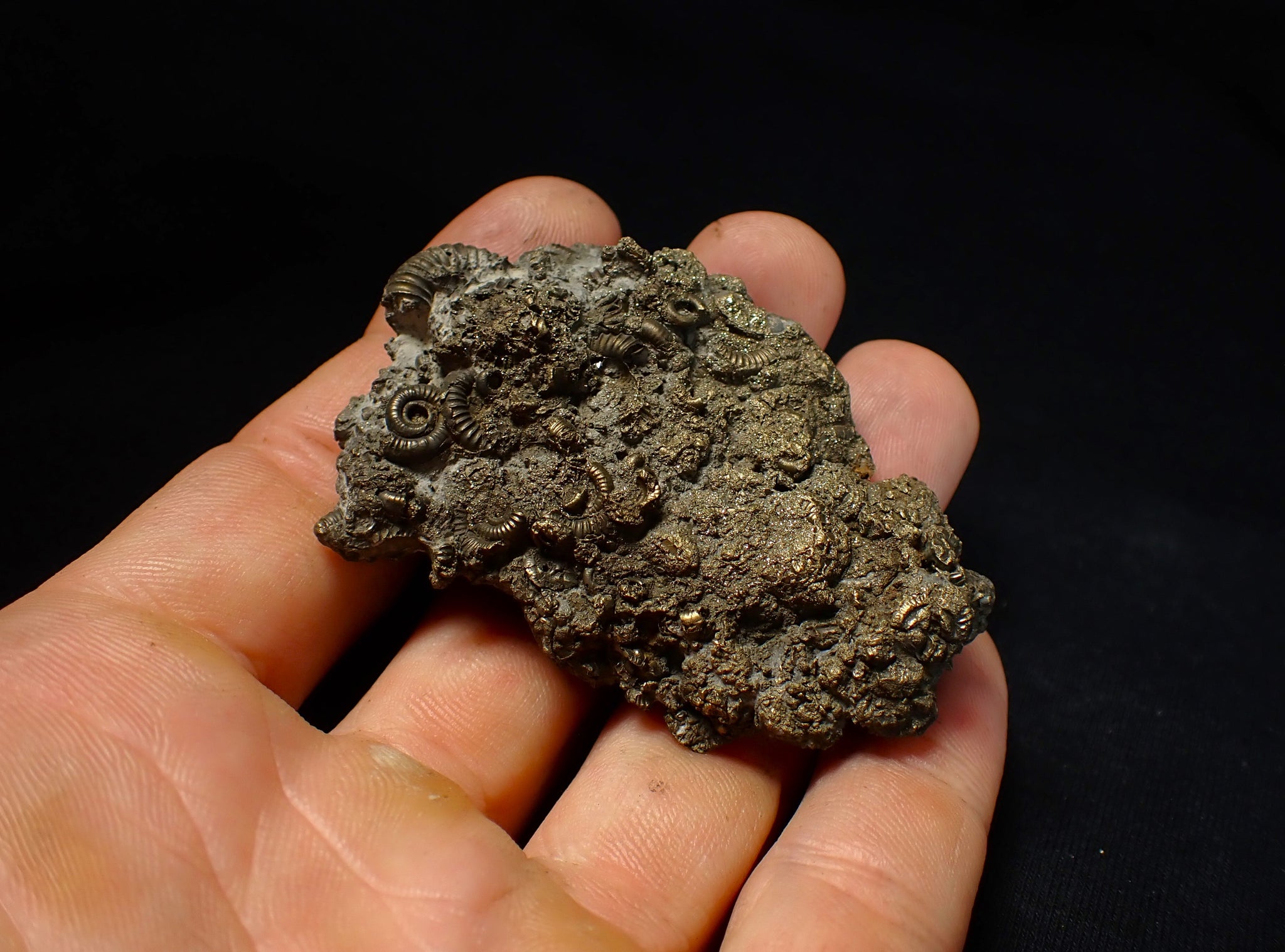 The fossil measures 64 mm (2.55 inches) across with matrix, which is large for this fossil type. The pyrite matrix contains lots of small ammonite shells which all accumulated together on the seafloor in the Early Jurassic. This is one of the highest densities of ammonites within a piece this size we have seen.