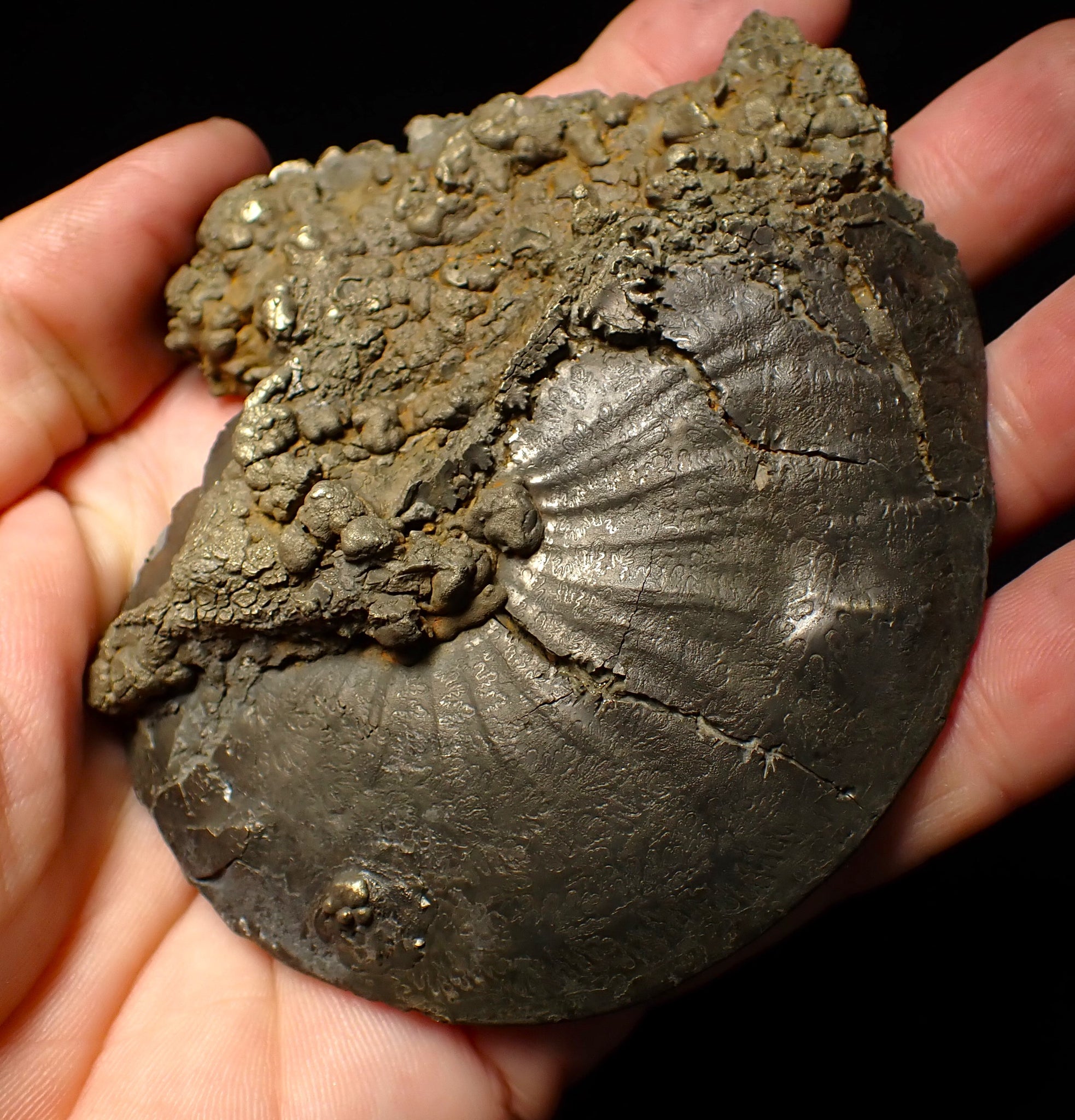 The fossil measures 103 mm (4.1 inches) across with matrix, which is very large for this species. The ammonite is very well preserved on both sides with highly detailed suture lines and ribs. The metallic iron pyrite colour and shine is beautiful. These ammonites are becoming much harder to find these days due to lack of erosion of the right layers of rock.