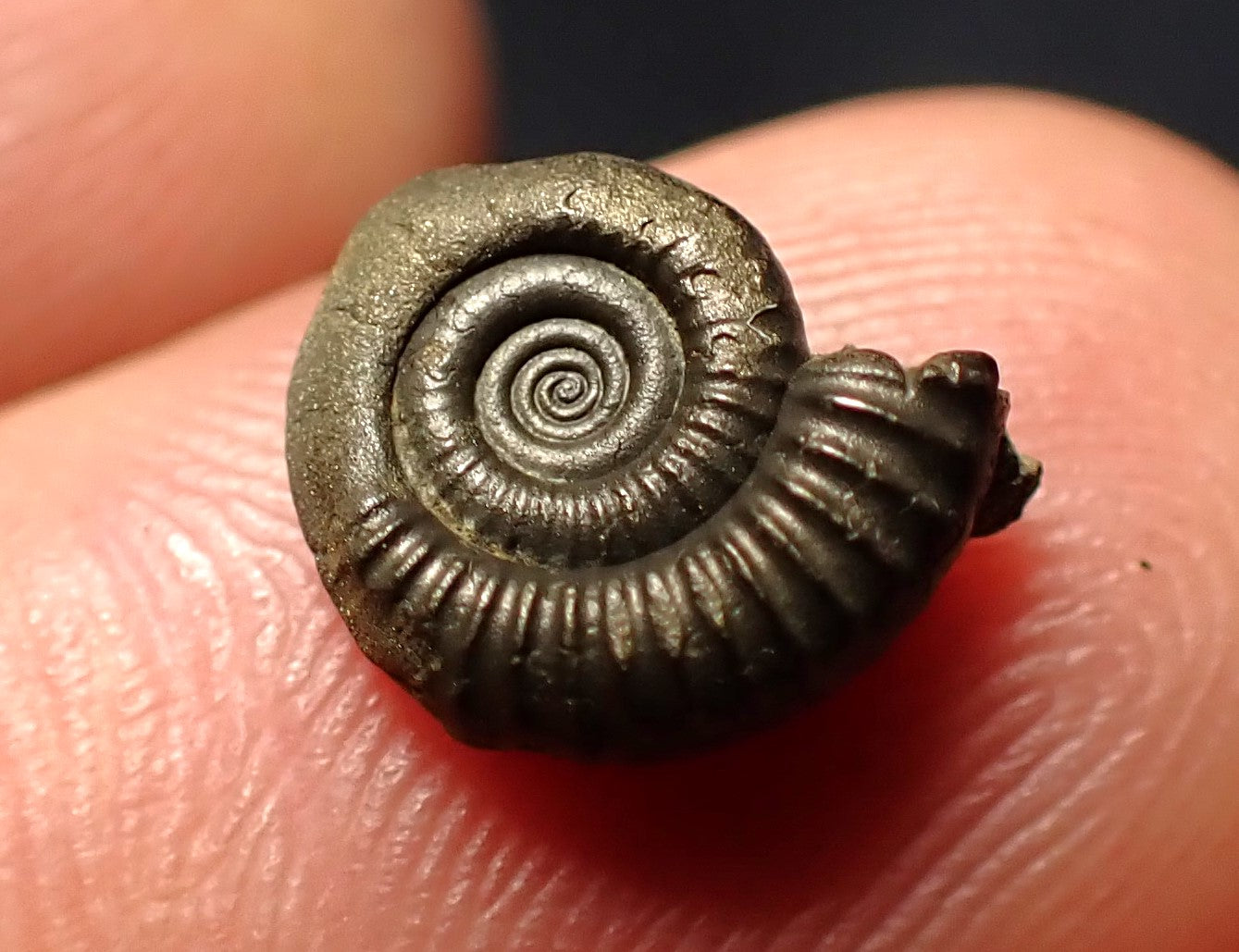 The fossil measures 11mm (0.45 inches) across, which is tiny for this fossil type and so ideal for jewellery purposes. The ammonite shell is very well preserved with great detail in the ribbing. It has a beautiful pyritic metallic shine.