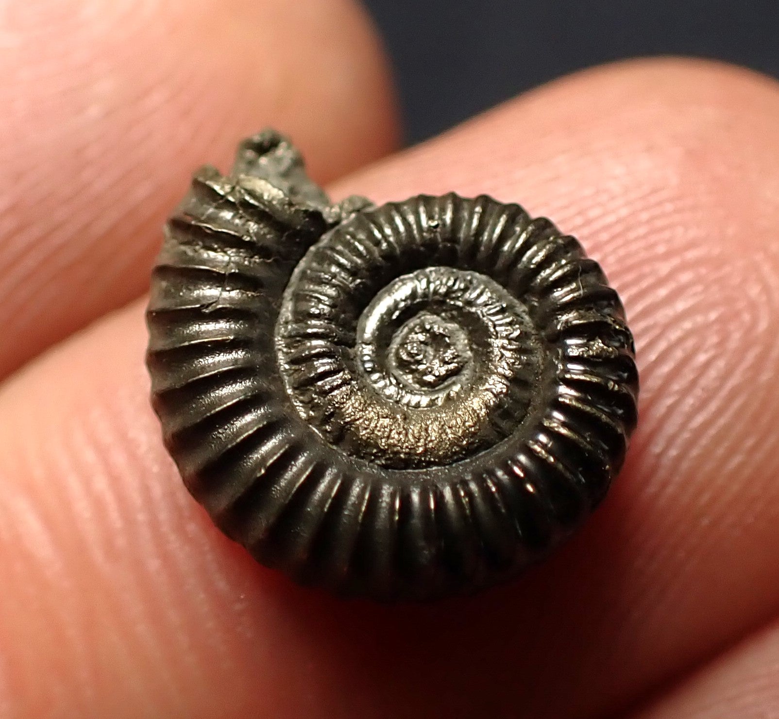 The fossil measures 14mm (0.55 inches) across, which is small for this species and so ideal for jewellery purposes. The ammonite shell is very well preserved with great detail in the ribbing. It has a beautiful pyritic metallic shine.