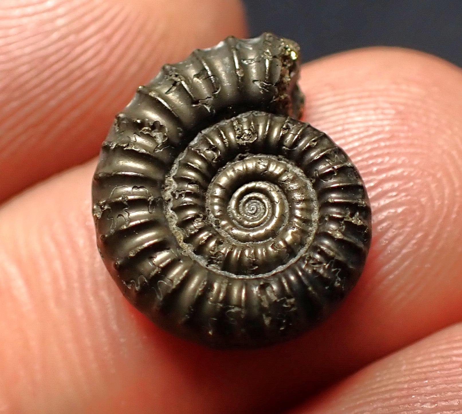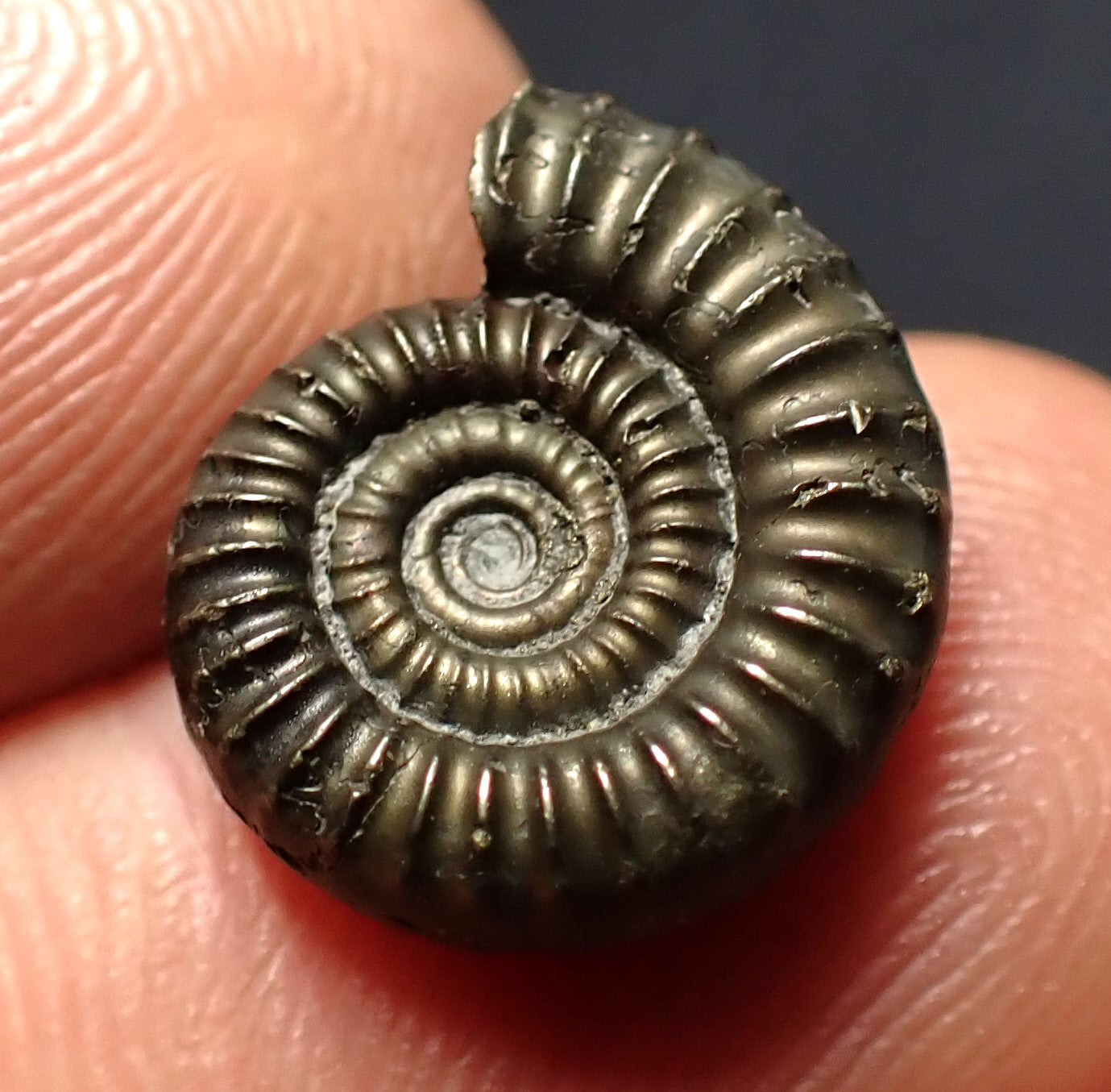 The fossil measures 16mm (0.62 inches) across. The ammonite shell is very well preserved with great detail in the ribbing. It has a beautiful pyritic metallic shine.