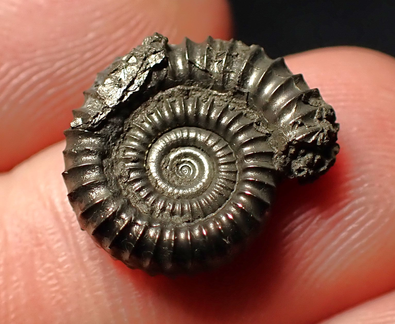The fossil measures 16mm (0.65 inches) across. The ammonite shell is very well preserved with great detail in the ribbing. It has a beautiful pyritic metallic shine.